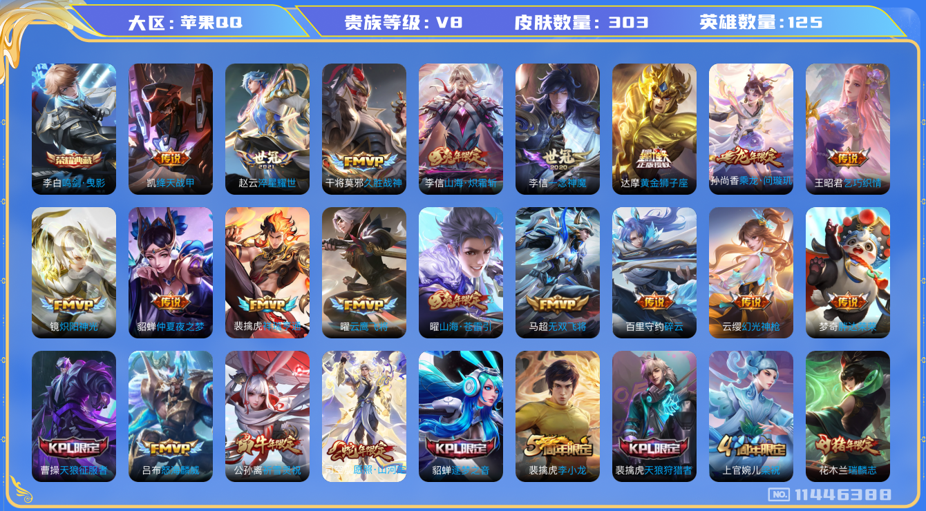 [11446388]V8 1典藏 25传说 125英雄 303皮肤 可修改实名 优质装备:鸣剑·曳影,黄金狮子座,云鹰飞将(小将军),绛天战甲(鸡嘴战神),久胜战神,炽阳神光,一念神魔,仲夏夜之梦(大飞蛾),胖达荣荣,乞巧织情,淬星耀世,无双飞将,碎云,山海·炽霜斩(李信年限),山海·苍雷引(电光曜子) 传说皮:乘龙·问璇玑(孙尚香年限),祥瑞亨通,幻光神枪 珍宝阁皮:万物之道,玩趣恶龙 限定皮:愿照·九州拓(澜年限),愿照·山河定(司空震年限),鸣野蒿,白虎志(电光耗子),神威(电光马子),飞衡(韩信年限),瑞麟志(木兰年限),齐天大圣,怒海麟威,五谷丰年,冰锋战神,梁祝,天狼狩猎者,逐梦之音,天狼征服者,祈雪灵祝(雪兔子),李小龙,孙行者,大圣娶亲,引擎之心,山海·玄木吟(马可年限) 史诗皮:鸭鸭历险记-刘禅,星界战将,龙之律动,藏狐·褐绒,紫霞仙子,苍穹之光,白龙吟,黄金分割率,特工魅影,千年之狐,高渐离燃音魔法,蒙恬荣光圣徽,无限星赏官,偶像歌手,白蛇,晚萤,暗夜猫娘,末日机甲-吕布,猫狗日记-孙策,时之恋人-孙尚香,乱世虎臣,节奏热浪,修罗,女仆咖啡,摇滚巨星,水果甜心,天才门将,星夜王子,心灵骇客,功夫厨神,德古拉伯爵,暗隐猎兽者,幽灵船长,鬼剑武藏,暗渊魔法,心灵战警,乐园奇幻夜,地狱岩魂,缤纷独角兽,乘风破浪,逐浪之夏,水晶猎龙者,曙光守护者,热力回旋,金属风暴,原初追逐者,圣诞狂欢,圣诞恋歌,鹰眼统帅,王者之锤,魅力维加斯,黎明之约,无心,未来纪元-赵云