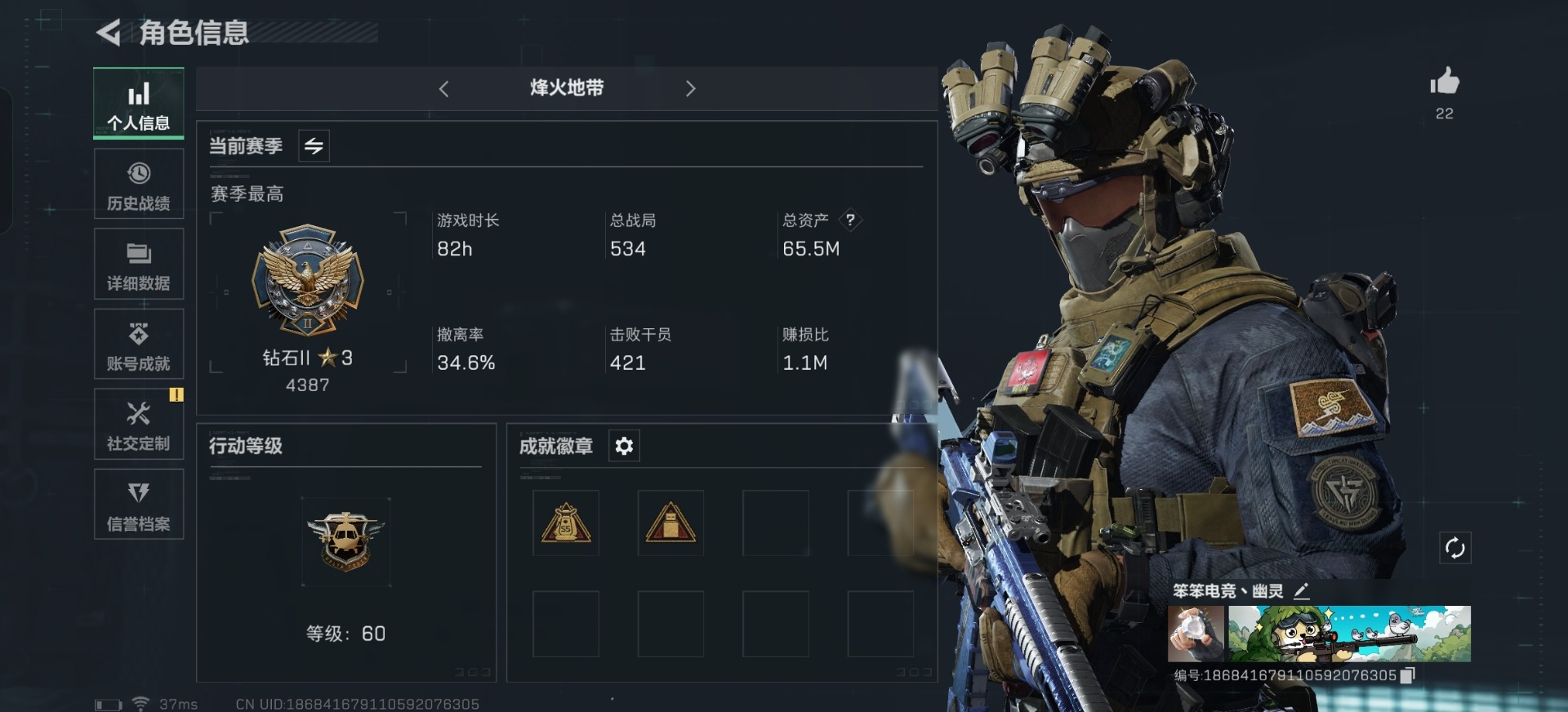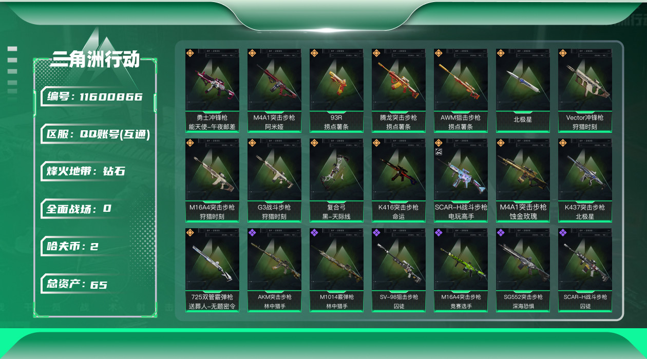 [11600866]总资产:65.5M 1干员外观 1近战传说 15传说枪械 哈夫币:2.751K 顶级安全箱(3×3)9.15号到期 可二次 可修改实名 优质装备:近战-北极星,K416突击步枪-命运(典藏),SCAR-H战斗步枪-电玩高手,顶级安全箱(3x3) 烽火地带段位:钻石 全面战场段位:列兵 传说武器皮肤:M16A4突击步枪-狩猎时刻,M4A1突击步枪-阿米娅,复合弓-黑-天际线,Vector冲锋枪-狩猎时刻,G3战斗步枪-狩猎时刻,AWM狙击步枪-捞点薯条,腾龙突击步枪-捞点薯条,93R-捞点薯条,勇士冲锋枪-能天使-午夜邮差,725双管霰弹枪-送葬人-无题密令,K437突击步枪-北极星,M4A1突击步枪-蚀金玫瑰 史诗武器皮肤:Ash-12战斗步枪-飓风行动,M16A4突击步枪-竞赛选手,PKM通用机枪-荒野求生,SG552突击步枪-深海恐惧,AKM突击步枪-林中猎手,SR-3M紧凑突击步枪-荒野求生,M1014霰弹枪-林中猎手,SVD狙击步枪-荒野求生,AS Val突击步枪-典狱官,M250通用机枪-囚徒,SV-98狙击步枪-囚徒,SCAR-H战斗步枪-囚徒,腾龙突击步枪-无垢,MP7冲锋枪-无垢,PSG-1射手步枪-无垢 干员外观:红狼-蚀金玫瑰