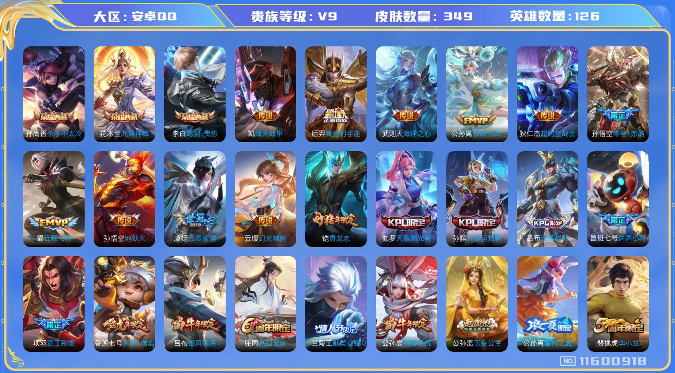 [11600918]V9 3典藏 17传说 126英雄 349皮肤 典藏英雄武则天 可修改实名 荣耀水晶:鸣剑·曳影,九霄神辉(木兰典藏),杀手不太冷 传说皮:云诺千山,幻光神枪,黄金射手座,零号·赤焰,地狱火,海洋之心,云霓雀翎,云鹰飞将(小将军),绛天战甲(鸡嘴战神),超时空战士-狄仁杰 珍宝阁皮:妄想食味,女武神,玩趣恶龙 限定皮:愿照·九州拓(澜年限),愿照·岁时盈(虞姬年限),逐霄战戟,鸣野蒿,白晶晶,高山流水,青龙志(铠年限),天狼运算者,梁祝,御风骁将(吕布年限),天狼溯光者,祈雪灵祝(雪兔子),李小龙,霸王别姬-项羽,霸王别姬-虞姬,默契交锋-兰陵王,孙行者,猪悟能,乒乒小将,蜜橘之夏,寅虎·瑞焰(虎皮蛋子),时之祈愿-云中君,玉兔公主 史诗皮:星界战将,茶境仙,器灵·浮梦炉,灵蛊蚀心,龙之律动,百相守梦-百里守约,涂山红红,东方月初,蒙犽顽岩魄,怒海争锋,海诺心动手记,蔬乡物语(鲁班七号),化蝶舞,紫霞仙子,电玩小子(小书包),黄金分割率,特工魅影,江河有灵,雪夜绮愿(周瑜),百解令(蒙犽),冰冠公主,偶像歌手,无限星赏官,暗夜猫娘,龙骑士(小龙虾),猫狗日记-大乔,时之恋人-孙尚香,乱世虎臣,节奏热浪,女仆咖啡,摇滚巨星,水果甜心,绅士熊喵,天才门将,星夜王子,心灵骇客,时之奇旅-安琪拉,功夫厨神,德古拉伯爵,暗隐猎兽者,幽灵船长,鬼剑武藏,暗渊魔法,心灵战警,舞动绿茵,地狱岩魂,纤云弄巧,拒霜思,缤纷独角兽,乘风破浪,逐浪之夏,水晶猎龙者,曙光守护者,金属风暴,圣诞狂欢,圣诞恋歌,鹰眼统帅,暗夜贵公子,魅力维加斯,赏金猎手,奇遇舞章,未来纪元-赵云