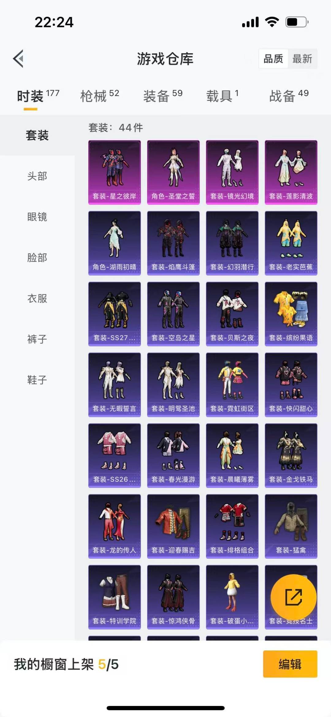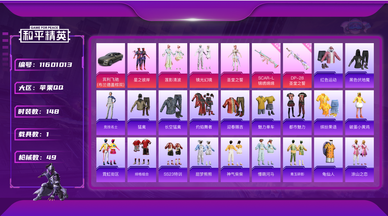 [11601013]4粉装 2特效枪 1载具 4印记 可二次 可修改实名 优质装备:宾利飞驰(布罗德盖棕双色),星之彼岸,DP-28圣堂之誓,SCAR-L-锦绣绵绵 热门装扮:莲影清波,镜光幻境,圣堂之誓 五级特效枪:五级SCAR-L-锦绣绵绵,五级DP-28-圣堂之誓 紫色装扮:SS23特训,都市魅力,长空猛禽,霓虹街区,迎春赐吉,缤纷果语,魅力单车,黑色伏地魔,龙的传人,龟仙人,涂山之恋,破蛋小黄鸡,空岛之星,红色运动,灼焰舞者,猛禽,竞技名士,惊鸿侠骨,甜梦熊熊,神气柴柴,懵萌河马,SS24特训(SS24特训套装),SS25特训,金戈铁马,锦衣飞扬,湖雨初晴,焰鹰斗篷,幻羽潜行,SS27特训,无暇誓言,明鸳圣池,晨曦薄雾,SS26特训,春光漫游,快闪甜心,贝斯之夜,青玉碎影,绯格组合 优质战备:圣堂之誓降落伞,江南烟雨降落伞,莲影清波降落伞,夜幕颂歌飞行器,拂晓神骑降落伞