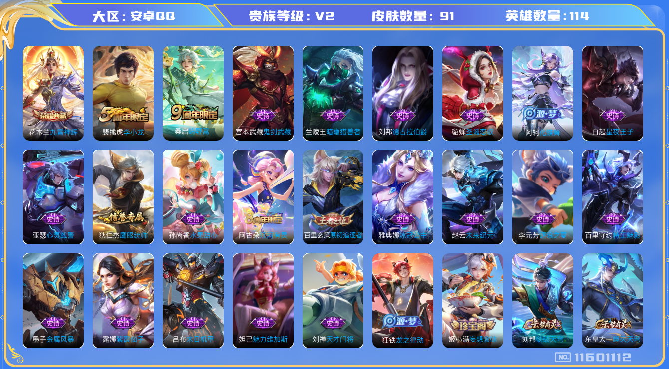 [11601112]V2 1典藏 1传说 114英雄 91皮肤 可修改实名 优质装备:九霄神辉(木兰典藏) 珍宝阁皮:妄想食味 限定皮:鸣野蒿,李小龙 史诗皮:化蝶舞,龙之律动,紫霞仙子,特工魅影,江河有灵,冰冠公主,末日机甲-吕布,水果甜心,天才门将,星夜王子,德古拉伯爵,暗隐猎兽者,鬼剑武藏,心灵战警,逐浪之夏,金属风暴,原初追逐者,圣诞恋歌,鹰眼统帅,魅力维加斯,未来纪元-赵云