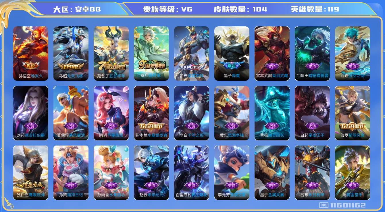 [11601162]V6 3传说 119英雄 104皮肤 可修改实名 优质装备:地狱火,无双飞将 珍宝阁皮:蔷薇恋人 限定皮:逐霄战戟,鸣野蒿,降魔,五谷丰年 史诗皮:龙之律动,破空之剑,埋骨钱,怒海争锋,黄金分割率,特工魅影,千年之狐,末日机甲-吕布,猫狗日记-孙策,节奏热浪,水果甜心,星夜王子,德古拉伯爵,暗隐猎兽者,幽灵船长,鬼剑武藏,暗渊魔法,乘风破浪,逐浪之夏,水晶猎龙者,箭羽风息,金属风暴,鹰眼统帅,魅力维加斯,赏金猎手,无心,未来纪元-赵云