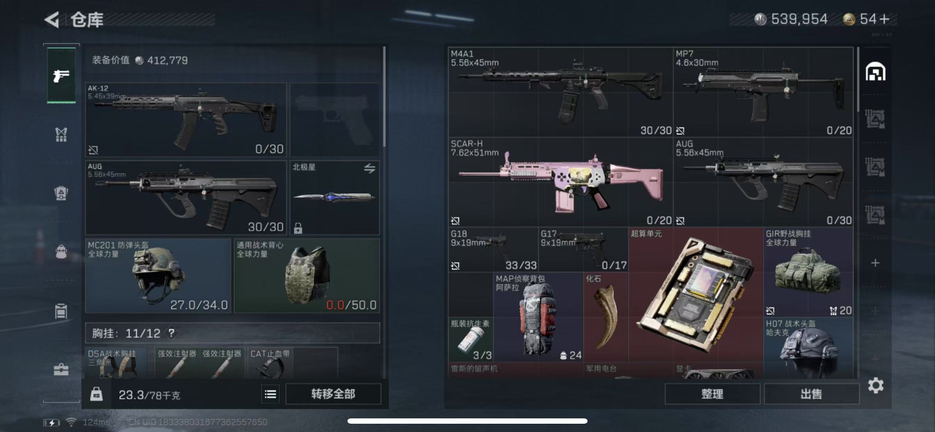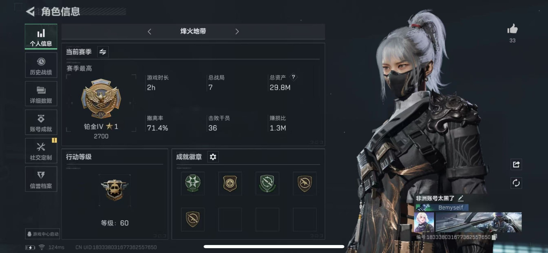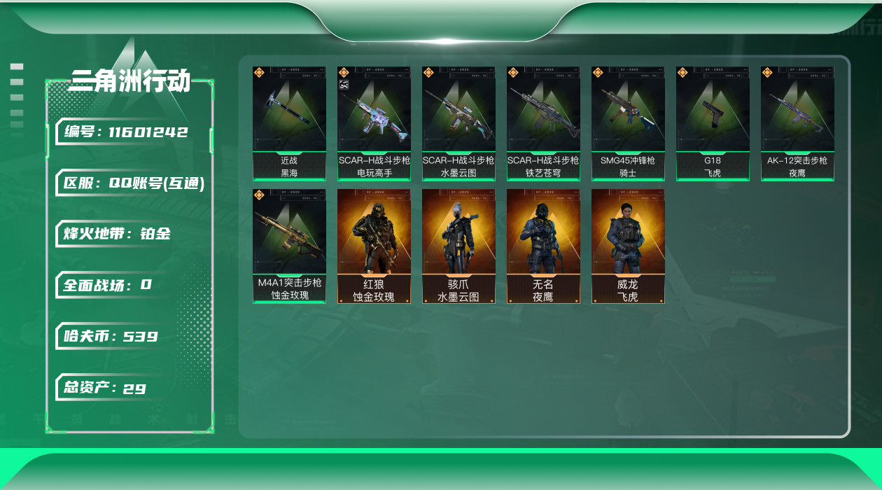 [11601242]总资产:29.8M 4干员外观 1近战传说 8传说枪械 哈夫币:539.954K 可二次 可修改实名 优质装备:近战-黑海,SCAR-H战斗步枪-电玩高手 烽火地带段位:铂金 全面战场段位:无段位 传说武器皮肤:SCAR-H战斗步枪-水墨云图,SCAR-H战斗步枪-铁艺苍穹,SMG45冲锋枪-骑士,G18-飞虎,AK-12突击步枪-夜鹰,M4A1突击步枪-蚀金玫瑰 干员外观:红狼-蚀金玫瑰,骇爪-水墨云图,无名-夜鹰,威龙-飞虎
