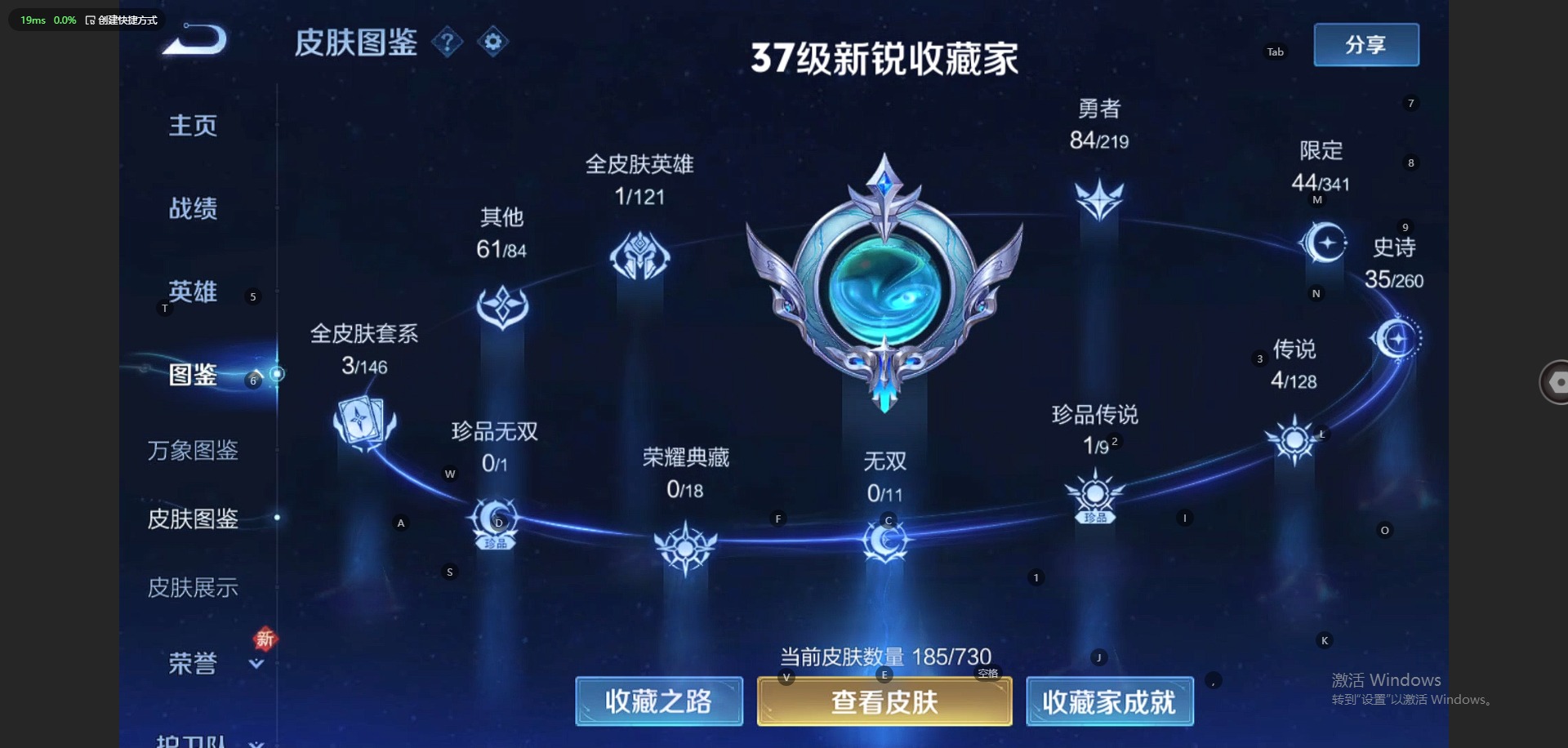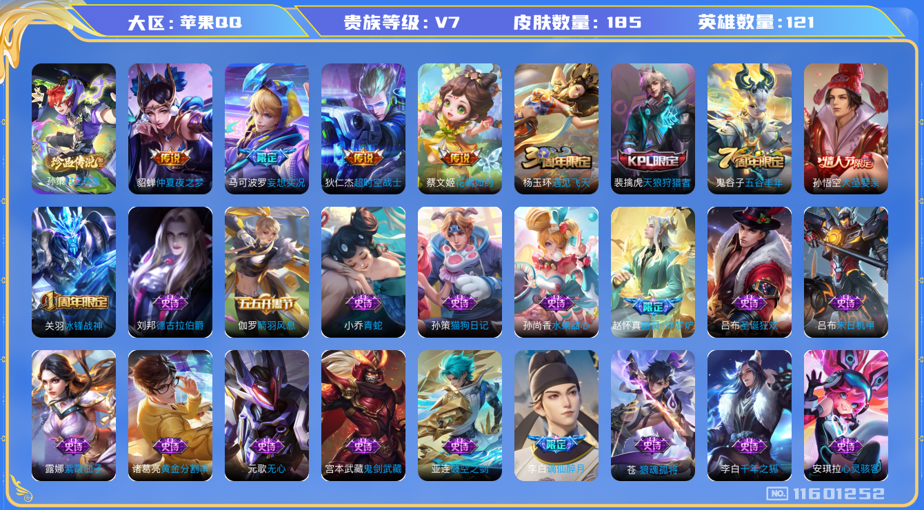 [11601252]V7 1珍品传说 4传说 121英雄 185皮肤 可修改实名 优质装备:仲夏夜之梦(大飞蛾),超时空战士-狄仁杰,花朝如约(花篮子),妄想实况 珍品传说:时之奇旅-孙策 限定皮:遇见飞天,五谷丰年,冰锋战神,天狼狩猎者,大圣娶亲 史诗皮:器灵·浮梦炉,狼魂孤将,谪仙醉月,破空之剑,决胜骁骑,百相守梦-百里守约,遇见神鹿,紫霞仙子,黄金分割率,千年之狐,青蛇,末日机甲-吕布,猫狗日记-孙策,女仆咖啡,摇滚巨星,水果甜心,心灵骇客,德古拉伯爵,鬼剑武藏,繁星吟游(呼啦呼啦),箭羽风息,金属风暴,圣诞狂欢,鹰眼统帅,魅力维加斯,无心