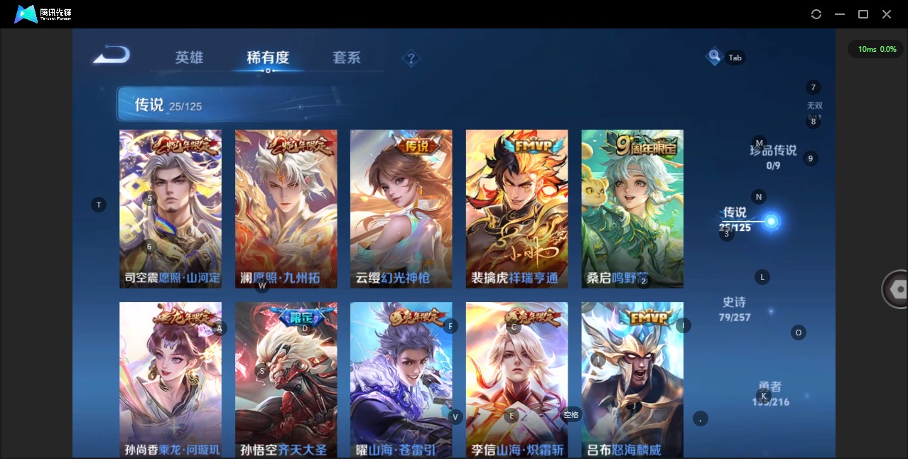 - [11998077]V7 1典藏 2传说 122英雄 154皮肤 可修改实名 优质装备:全息碎影(猴子典藏),音你心动-小乔 珍宝阁皮:优雅恋人 限定皮:鸣野蒿,高山流水,五谷丰年,御风骁将(吕布年限),李小龙 史诗皮:电玩小子(小书包),白龙吟,千年之狐,江河有灵,白蛇,电玩·爆裂旋风,猫狗日记-孙策,猫狗日记-大乔,节奏热浪,摇滚巨星,水果甜心,天才门将,心灵骇客,暗隐猎兽者,鬼剑武藏,乘风破浪,水晶猎龙者,金属风暴,鹰眼统帅,魅力维加斯,未来纪元-赵云