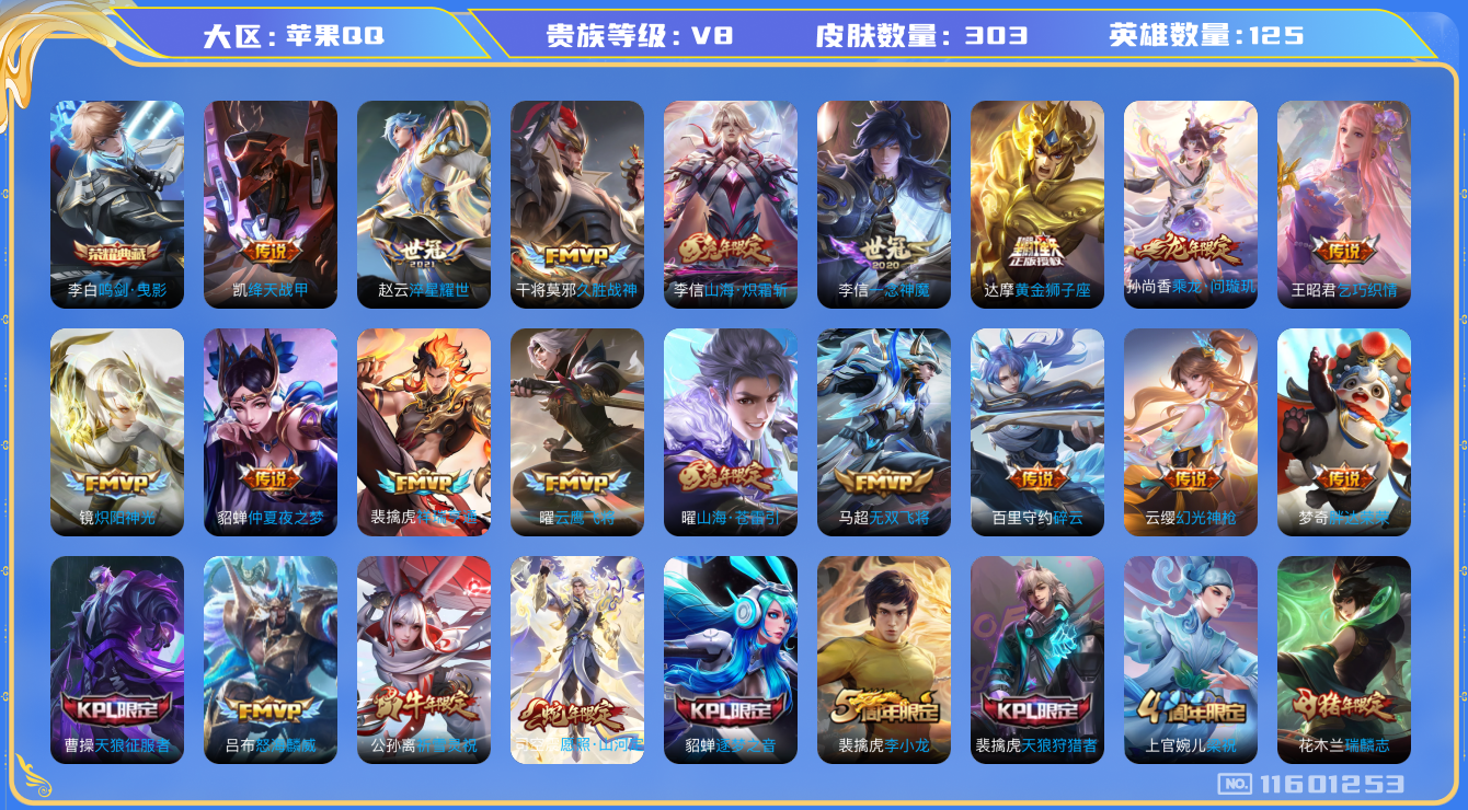 [11601253]V8 1典藏 25传说 125英雄 303皮肤 可修改实名 优质装备:鸣剑·曳影,黄金狮子座,云鹰飞将(小将军),绛天战甲(鸡嘴战神),久胜战神,炽阳神光,一念神魔,仲夏夜之梦(大飞蛾),胖达荣荣,乞巧织情,淬星耀世,无双飞将,碎云,山海·炽霜斩(李信年限),山海·苍雷引(电光曜子) 传说皮:乘龙·问璇玑(孙尚香年限),祥瑞亨通,幻光神枪 珍宝阁皮:万物之道,玩趣恶龙 限定皮:愿照·九州拓(澜年限),愿照·山河定(司空震年限),鸣野蒿,白虎志(电光耗子),神威(电光马子),飞衡(韩信年限),瑞麟志(木兰年限),齐天大圣,怒海麟威,五谷丰年,冰锋战神,梁祝,天狼狩猎者,逐梦之音,天狼征服者,祈雪灵祝(雪兔子),李小龙,孙行者,大圣娶亲,引擎之心,山海·玄木吟(马可年限) 史诗皮:鸭鸭历险记-刘禅,星界战将,龙之律动,藏狐·褐绒,紫霞仙子,苍穹之光,白龙吟,黄金分割率,特工魅影,千年之狐,高渐离燃音魔法,蒙恬荣光圣徽,无限星赏官,偶像歌手,白蛇,晚萤,暗夜猫娘,末日机甲-吕布,猫狗日记-孙策,时之恋人-孙尚香,乱世虎臣,节奏热浪,修罗,女仆咖啡,摇滚巨星,水果甜心,天才门将,星夜王子,心灵骇客,功夫厨神,德古拉伯爵,暗隐猎兽者,幽灵船长,鬼剑武藏,暗渊魔法,心灵战警,乐园奇幻夜,地狱岩魂,缤纷独角兽,乘风破浪,逐浪之夏,水晶猎龙者,曙光守护者,热力回旋,金属风暴,原初追逐者,圣诞狂欢,圣诞恋歌,鹰眼统帅,王者之锤,魅力维加斯,黎明之约,无心,未来纪元-赵云