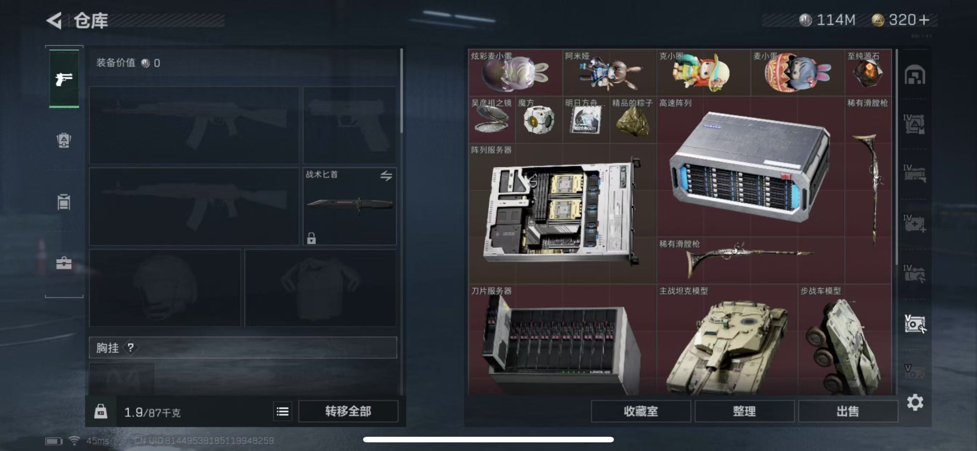 - [11446429]总资产:204.2 2干员外观 4传说枪械 顶级安全箱(9.17到期) 可二次 可修改实名 优质装备:顶级安全箱(3x3) 烽火地带段位:铂金 全面战场段位:军士长 哈夫币:20.067 传说武器皮肤:复合弓-黑-天际线,M4A1突击步枪-阿米娅,725双管霰弹枪-送葬人-无题密令,勇士冲锋枪-能天使-午夜邮差 史诗武器皮肤:PKM通用机枪-荒野求生,SR-3M紧凑突击步枪-荒野求生,M16A4突击步枪-竞赛选手,SVD狙击步枪-荒野求生,SV-98狙击步枪-林中猎手,PSG-1射手步枪-无垢,M250通用机枪-囚徒,SCAR-H战斗步枪-囚徒,腾龙突击步枪-无垢,MP7冲锋枪-无垢,M700狙击步枪-竞技风 干员外观:蜂医-送葬人·无题密令(S5),露娜-黑·天际线