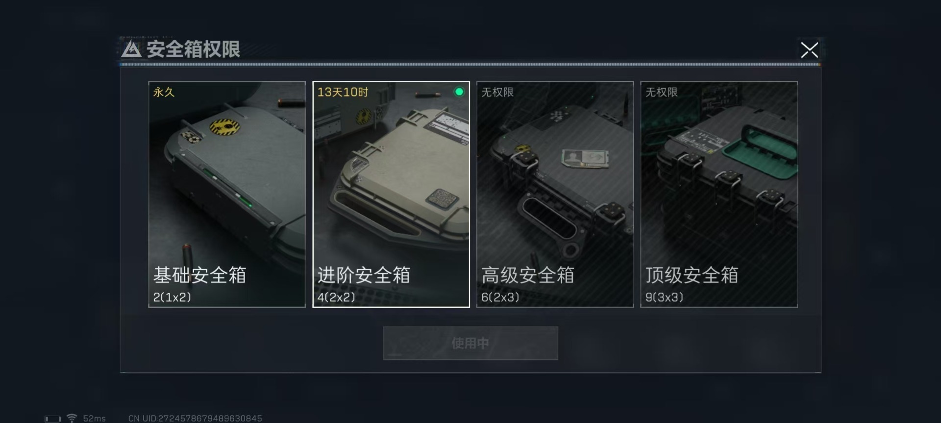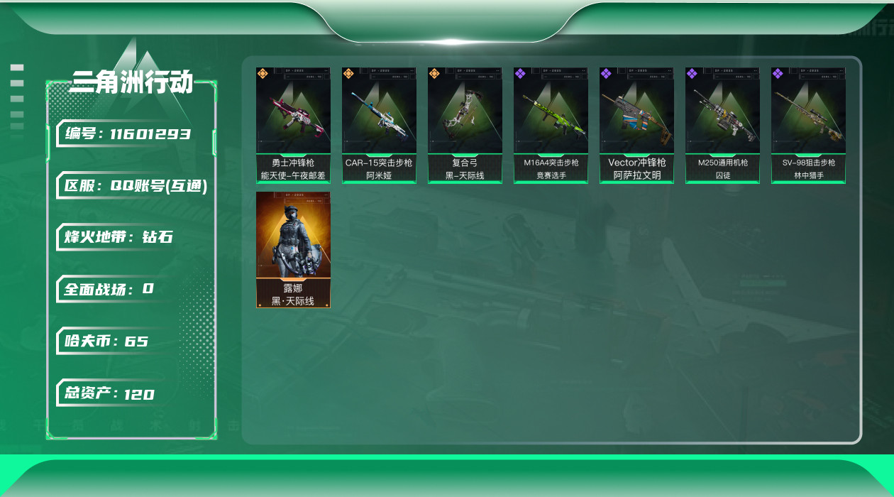 [11601293]总资产:120.6M 1干员外观 3传说枪械 哈夫币:65.296K 进阶安全箱(2×2)9.15号到期 可二次 可修改实名 烽火地带段位:钻石 全面战场段位:无段位 传说武器皮肤:勇士冲锋枪-能天使-午夜邮差,复合弓-黑-天际线,CAR-15突击步枪-阿米娅 史诗武器皮肤:M16A4突击步枪-竞赛选手,SV-98狙击步枪-林中猎手,M250通用机枪-囚徒,Vector冲锋枪-阿萨拉文明 干员外观:露娜-黑·天际线