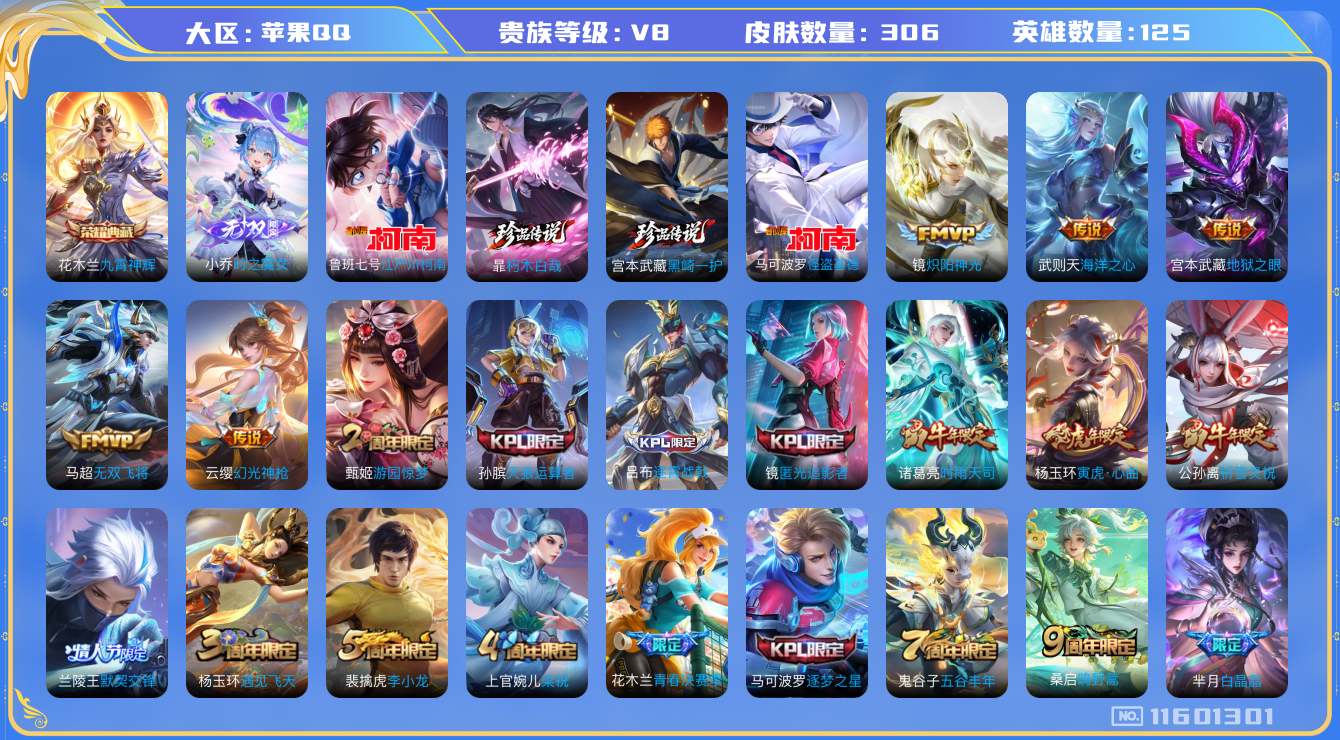 [11601301]V8 1典藏 1无双 4珍品传说 11传说 125英雄 306皮肤 典藏英雄武则天 兰陵王小国标 可修改实名 优质装备:九霄神辉(木兰典藏),小乔时之魔女(小乔无双),江户川柯南,怪盗基德,朽木白哉,黑崎一护,炽阳神光,海洋之心,地狱之眼,无双飞将 传说皮:幻光神枪 珍宝阁皮:妄想食味,蔷薇恋人 限定皮:逐霄战戟,鸣野蒿,前尘镜,白晶晶,时雨天司(水龙头),遇见飞天,五谷丰年,冰锋战神,天狼运算者,游园惊梦,梁祝,逐梦之星,祈雪灵祝(雪兔子),李小龙,逐梦之影,霸王别姬-虞姬,默契交锋-兰陵王,青春决赛季,神奇女侠,匿光追影者,寅虎·心曲(虎婆) 史诗皮:鸭鸭历险记-刘禅,器灵·浮梦炉,瑰影绮梦,化蝶舞,星界战将,龙之律动,石田雨龙,茶境仙,芈月浮光幕影,蔬乡物语(鲁班七号),百相守梦-百里守约,紫霞仙子,苍穹之光,黄金分割率,特工魅影,千年之狐,蒙恬荣光圣徽,偶像歌手,白蛇,暗夜猫娘,冰冠公主,猫狗日记-孙策,猫狗日记-大乔,时之恋人-孙尚香,乱世虎臣,节奏热浪,摇滚巨星,水果甜心,绅士熊喵,天才门将,心灵骇客,功夫厨神,德古拉伯爵,暗隐猎兽者,幽灵船长,鬼剑武藏,心灵战警,纤云弄巧,拒霜思,缤纷独角兽,乘风破浪,逐浪之夏,水晶猎龙者,曙光守护者,金属风暴,原初追逐者,圣诞狂欢,圣诞恋歌,鹰眼统帅,魅力维加斯,黎明之约,无心