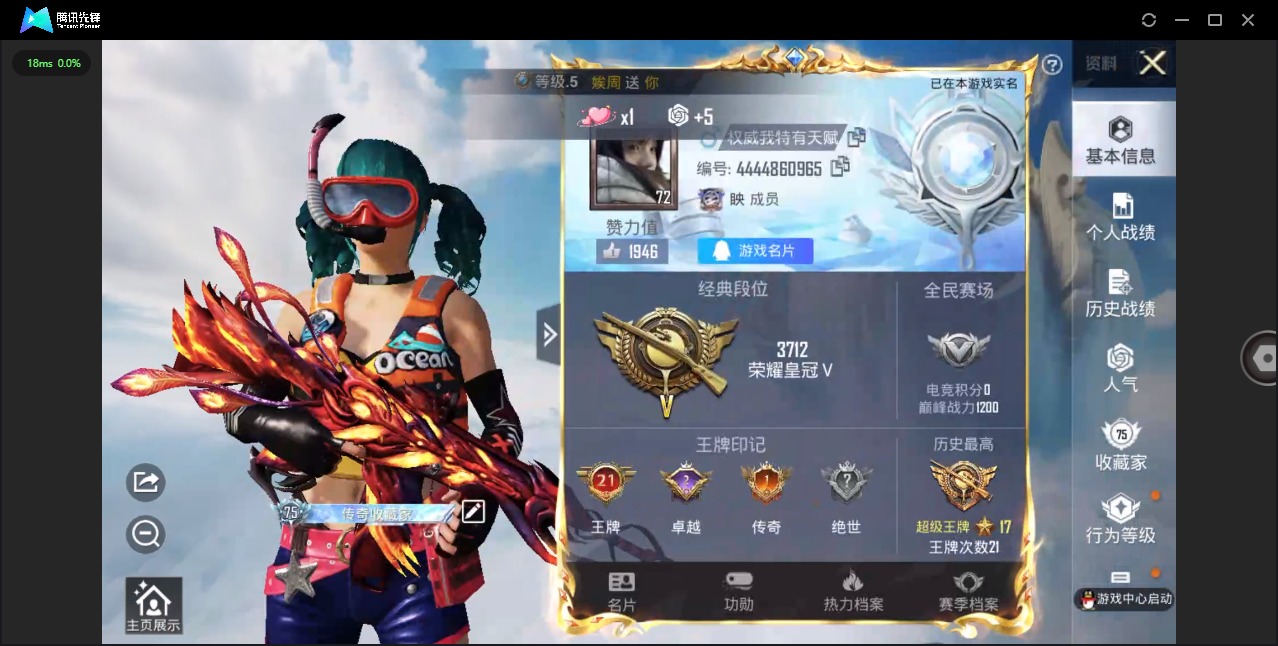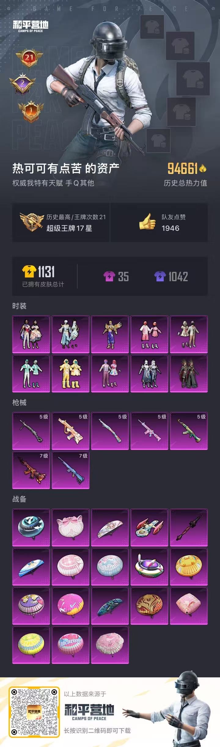 - PX_2095319- 苹果手Q-5王牌印记-5粉装-3特效枪-0载具-47972热力值-113套装-159枪皮-0卓越印记-0传奇印记 【5粉装】,雪国幻梦,缤纷油彩,繁龙极客,闲梦青缨,馨动时刻 【3特效枪】Kar98K-巳巳如意-4级 Vector-飒粉甜心-6级 平底锅-仲夏莫吉托-3级 【5稀有紫装】,暗影哥特,浪漫天命,胖达圆圆,龟仙人,金羽特工, 【113稀有时装】,SS31特训,