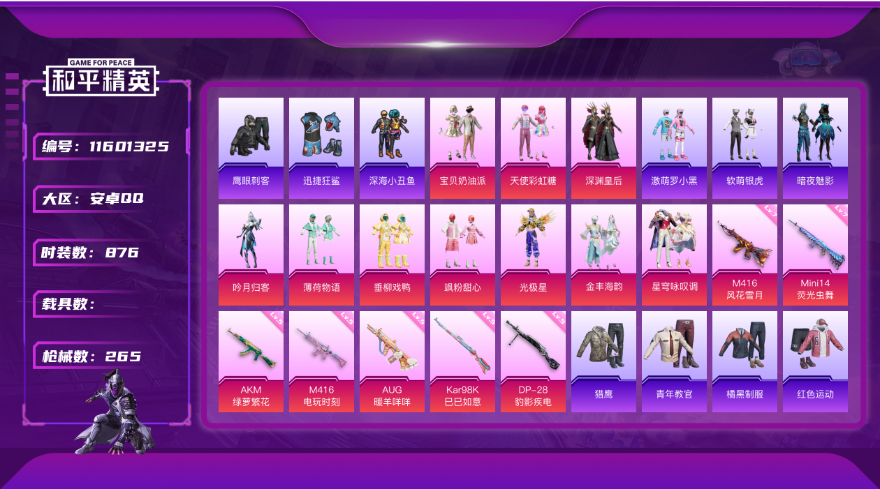 [11601325]10粉装 7特效枪 21印记 可二次 可修改实名 优质装备:Mini14荧光虫舞,深渊皇后,宝贝奶油派,天使彩虹糖,M416风花雪月,AKM绿萝繁花,七级M416-风花雪月,七级Mini14-荧光虫舞,M416电玩时刻,AUG-暖羊咩咩,星穹咏叹调,Kar98K-巳巳如意 热门装扮:吟月归客,薄荷物语,垂柳戏鸭,飒粉甜心,光极星,金丰海韵,软萌银虎,激萌罗小黑,迅捷狂鲨,鹰眼刺客,深海小丑鱼,暗夜魅影 五级特效枪:五级Kar98K-巳巳如意,五级DP-28-豹影疾电,五级AUG-暖羊咩咩,五级M416-电玩时刻,五级AKM-绿萝繁花 紫色装扮:SS22特训,莱茵河畔,飞狐塔尔斯,妙红点点,幻彩翩翩,SS23特训,俏皮奶喵,暖心橘喵,娇憨猪猪,萌趣咩咩,SS21特训,SS30特训套装,军械专家,人气偶像,冰川特警,冷焰舞者,千禧之恋,青涩时光,SS20特训,SS31特训套装,云朵鹅,雪绒豹,SS33特训套装,顶瓜瓜,青春冒险家,潮流游乐家,SS15特训,闪银刀客,时空追击者,暴风机械师,星辰守护者,SS16特训,冰爽风暴,星梦畅游,镭射皇者,闪金天王,银白舞王,SS13特训,冰爽海盐,治愈之星,迅捷之星,科技之星,SS14特训,萌趣颜团子,特种颜团子,虚音幻奏,雪兔飞飞,飞驰魅影,音速流光,极速竞梦,SS19特训,浑天鲲鹏,甜心亚梦,豚鼠丹丹,瑞龙福将,团圆交子,SS17特训,异彩先驱,缤纷焰火,SS18特训,吉莉礼服,长空猛禽,迎春赐吉,都市魅力,酒红色名流,酷潮明星,野性战魂,雨林探路者,雪山精英,雪鹰学院,霓虹极客,霓虹街区,青年教官,缤纷果语,耀眼新星,蓝彩潮人,蓝色守护者,蓝色运动,虎虎生威吉莉,街头潮人,超能勇士,青春校园,蜜露汐语,蓝海鲸歌,风行保卫者,龙的传人,飞行日记,魅力单车,鹤鸣,麻辣教官,黄色伏地魔,黄色名流,黄色运动,黎明保卫者,黑色伏地魔,龙腾端午,龟仙人,冰河战士,龙魂突击队,蝶变,香桃花海,绮丽涂鸦,极地朋克,极速红龙,柠萌假日,棕色飞行服,橘黑制服,沙漠兵团,海岛探路者,涂山之恋,深蓝色名流,湖蓝色名流,幻世战舞者,夏日音浪,完美偶像,帅气教官,幻影武者,战地督导,探宝勇士,滨海假日,甜蜜熊情侣,登山爱好者,白熊同盟,白色伏地魔,破晓战魂,破蛋小黄鸡,王牌教练,福星高照,空岛之星,空投萌叽,竞技达人朋克,红色运动,猛禽,滨海厨神,