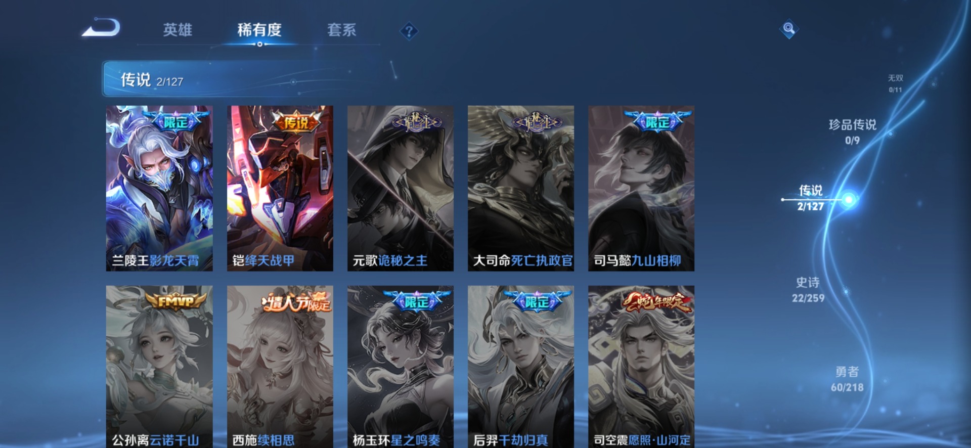 宫本武藏鬼剑武藏,兰陵王暗隐猎兽者,花木兰水晶猎龙者,亚瑟心灵战警,李元芳匿光侦查者,鲁班七号电玩小子,项羽苍穹之光,吕布圣诞狂欢,露娜紫霞仙子,澜赏金猎手,嫦娥拒霜思