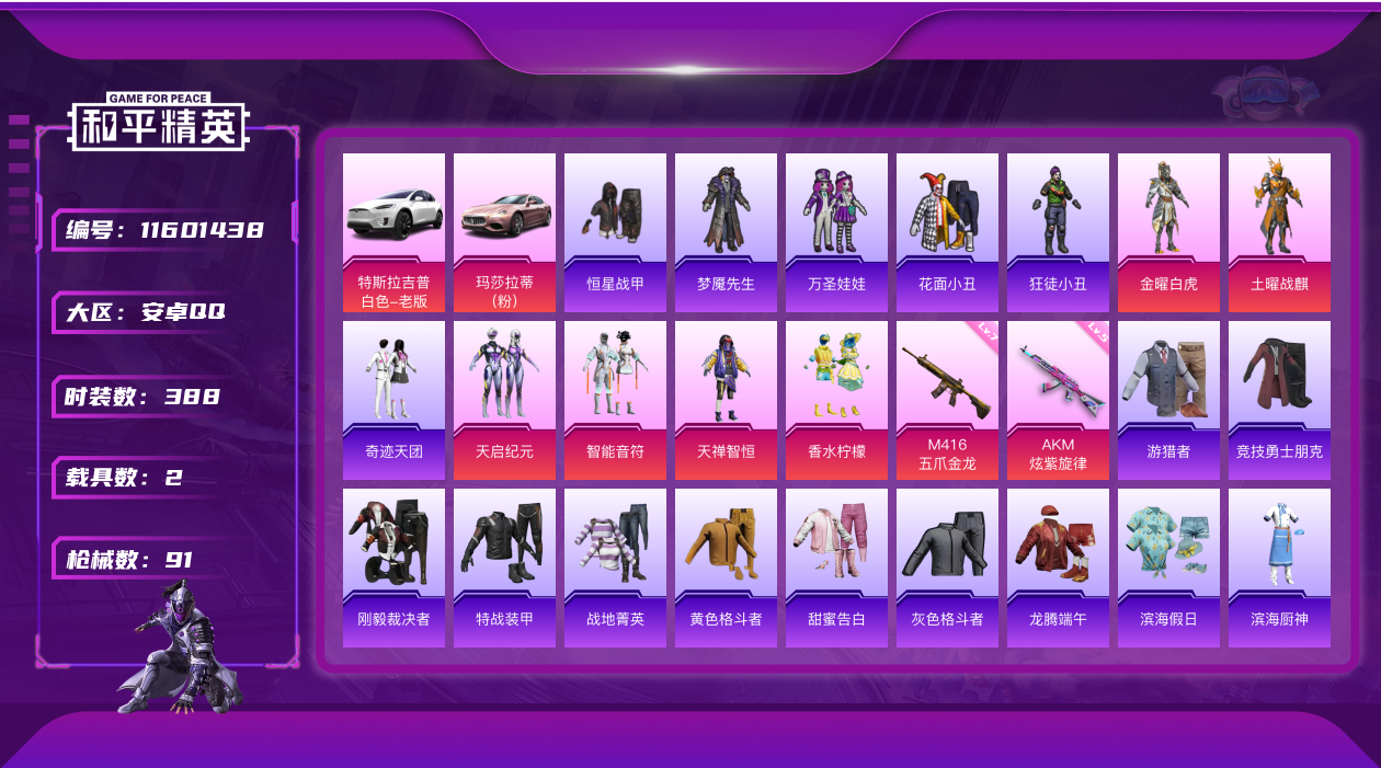 [11601438]6粉装 2特效枪 2载具 4印记 可二次 可修改实名 优质装备:玛莎拉蒂Ghibli(粉),特斯拉Model X(珍珠白),AKM炫紫旋律,M416五爪金龙,天启纪元,土曜战麒,金曜白虎,智能音符,香水柠檬,天禅智恒,七级M416-五爪金龙 热门装扮:奇迹天团,恒星战甲,狂徒小丑,万圣娃娃,梦魇先生,花面小丑 五级特效枪:五级Kar98K-伏魔团 紫色装扮:SS3特训,SS4特训,SS5特训,冰原使者,,冰川特警,决胜时刻,凛冬战士,刚毅裁决者,北国孤狼,千禧之恋,青涩时光,银白舞王,SS13特训,浪漫樱花,野性战魂,金鼠迎春,雪山征服者,雪山精英,雷霆特警,霓虹街区,风暴特警,耀动青春,跃动心情,风行保卫者,龙腾端午,魅力单车,黄色格斗者,和平特警,朋克治安官,格斗先锋,派对绅士,滨海假日,圣诞大吉,坚韧舞者,夏日音浪,夜莺强袭者,幻世保卫者,怒火燎原,战地菁英,攀登者,滨海厨神,磁暴战甲,甜蜜菠萝,疯狂小兔子,神秘领域,甜蜜告白,游猎者,竞技勇士朋克,灰色格斗者,牛气满满,特战装甲,萌主吾皇,精神漫游,炽焰拳师,格斗专家,SS6特训,银河圣歌,闪耀星光,黑色刀锋,核芯基因,拳皇97八神庵,SS7特训,人鱼之吻,摇滚狂鲨,清香五月粽,深蓝冒险家,迷域探索者,惊声尖笑,恶魔人蛛,黑夜传说,玲珑飞花,SS8特训,幻世猎手,逆风勇士,SS12特训,智慧之神,SS9特训,红酒骑士,暗夜契约,机械哨兵,旷野奇兵,蜘蛛突变者,WiFi精灵,丛林猎人,传奇侦探,特种空勤,半糖蓝莓,奇趣企鹅 优质战备:至尊龙雀飞行服,至尊龙雀降落伞,星之信仰降落伞,深海曼妙降落伞,古堡领主降落伞,飞行器-甜蜜誓约
