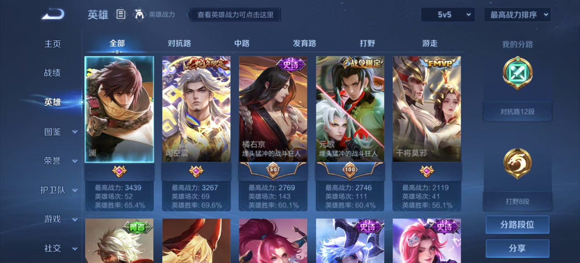 - PX_2082811-贵族等级: V5 英雄数: 121 皮肤数: 101 星传说: 幽冥之眼 传说皮: 黄金射手座,冠军飞将,云鹰飞将,澜逐花归海 限定皮: 游园惊梦,白鹤梁神女,蜜橘之夏,凤求凰,高山流水,寅虎·心曲