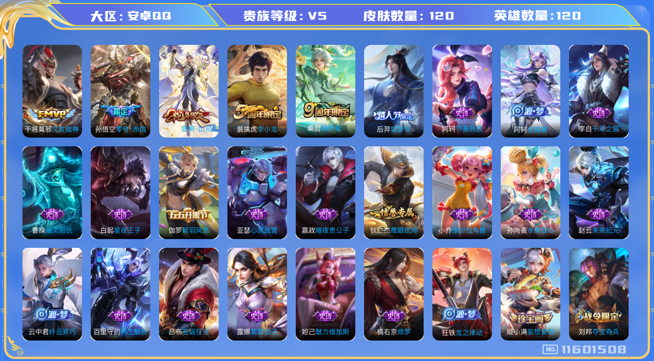 [11601508]V5 4传说 120英雄 120皮肤 可修改实名 优质装备:久胜战神,零号·赤焰 珍宝阁皮:妄想食味 限定皮:愿照·山河定(司空震年限),鸣野蒿,李小龙,如梦令-后羿 史诗皮:化蝶舞,龙之律动,紫霞仙子,特工魅影,千年之狐,节奏热浪,修罗,水果甜心,星夜王子,幽灵船长,心灵战警,纤云弄巧,缤纷独角兽,箭羽风息,圣诞狂欢,鹰眼统帅,暗夜贵公子,魅力维加斯,未来纪元-赵云