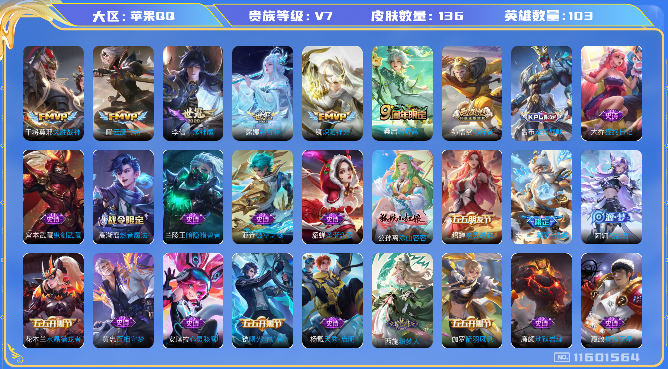 [11601564]V7 6传说 103英雄 136皮肤 可修改实名 优质装备:云鹰飞将(小将军),久胜战神,炽阳神光,一念神魔,霜月吟,涂山容容 限定皮:逐霄战戟,鸣野蒿,孙行者 史诗皮:化蝶舞,星界战将,龙之律动,雪豹·霜爪,藏狐·褐绒,石田雨龙,百相守梦-周瑜,茶境仙,破空之剑,百相守梦-百里守约,百相守梦-黄忠,织梦人,紫霞仙子,黄金分割率,特工魅影,高渐离燃音魔法,冰冠公主,猫狗日记-孙策,猫狗日记-大乔,时之恋人-孙尚香,摇滚巨星,水果甜心,心灵骇客,功夫厨神,暗隐猎兽者,鬼剑武藏,暗渊魔法,天秀·启明,地狱岩魂,水晶猎龙者,曙光守护者,箭羽风息,唤灵魅影,圣诞恋歌,鹰眼统帅,魅力维加斯,黎明之约,未来纪元-赵云