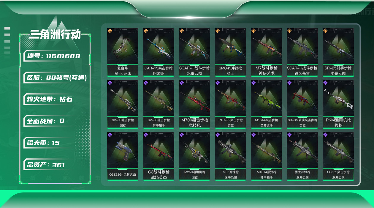 [11601608]可二次 可修改实名 实名:可修改 烽火地带段位:钻石 全面战场段位:上等兵 总资产:361.7 哈夫币:15.436 传说武器皮肤:SCAR-H战斗步枪-水墨云图,SR-25射手步枪-水墨云图,SCAR-H战斗步枪-铁艺苍穹,SMG45冲锋枪-骑士,复合弓-黑-天际线,CAR-15突击步枪-阿米娅,M7战斗步枪-神秘艺术 史诗武器皮肤:SR-3M紧凑突击步枪-英雄,QBZ95-1突击步枪-ACE,M4A1突击步枪-特勤执行,AUG突击步枪-特勤执行,Vector冲锋枪-红色彗星,PTR-32战斗步枪-ACE,SKS射手步枪-ACE,AUG突击步枪-蝮蛇,M700狙击步枪-蝮蛇,PKM通用机枪-蝮蛇,G3战斗步枪-战场英杰,MP5冲锋枪-深海恐惧,勇士冲锋枪-深海恐惧,SG552突击步枪-深海恐惧,AKM突击步枪-林中猎手,M16A4突击步枪-竞赛选手,M1014霰弹枪-林中猎手,SV-98狙击步枪-林中猎手,PTR-32突击步枪-英雄,M250通用机枪-囚徒,SV-98狙击步枪-囚徒,沙漠之鹰-曙光,S12K霰弹枪-曙光,M700狙击步枪-竞技风,QSZ92G-风林火山 干员外观:威龙-壮志凌云,骇爪-水墨云图