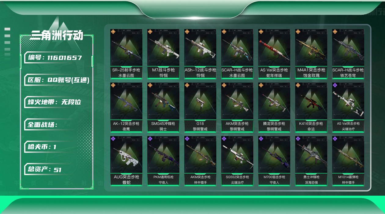 [11601657]可二次 可修改实名 高级安全箱(2×3)7.1号到期 实名:可修改 烽火地带段位:无段位 全面战场段位:无段位 总资产(M):51.2 哈夫币:1.600 传说武器皮肤:K416突击步枪-命运(典藏),SCAR-H战斗步枪-水墨云图,SR-25射手步枪-水墨云图,AS Val突击步枪-蛇年祥瑞,SCAR-H战斗步枪-铁艺苍穹,AK-12突击步枪-夜鹰,腾龙突击步枪-黎明警戒,AKM突击步枪-黎明警戒,G18-黎明警戒,SMG45冲锋枪-骑士,M4A1突击步枪-蚀金玫瑰,M7战斗步枪-怜悯,ASh-12战斗步枪-怜悯 史诗武器皮肤:QBZ95-1突击步枪-ACE,M4A1突击步枪-特勤执行,AUG突击步枪-特勤执行,Vector冲锋枪-红色彗星,AUG突击步枪-蝮蛇,M700狙击步枪-蝮蛇,PKM通用机枪-蝮蛇,SR-25射手步枪-尖端治疗,M1014霰弹枪-林中猎手,PKM通用机枪-守夜人,AS Val突击步枪-尖端治疗,M700狙击步枪-守夜人,SG552突击步枪-尖端治疗,PKM通用机枪-英雄,勇士冲锋枪-深海恐惧,SG552突击步枪-深海恐惧,AKM突击步枪-林中猎手,SVD狙击步枪-阿萨拉工艺,Vector冲锋枪-阿萨拉文明,93R-博士,QSZ92G-风林火山,S12K霰弹枪-曙光 干员外观:红狼-蚀金玫瑰
