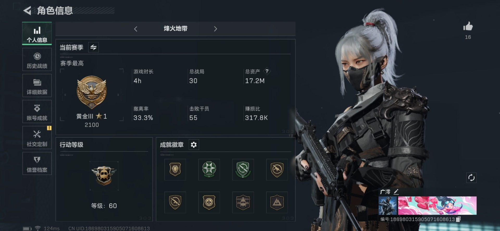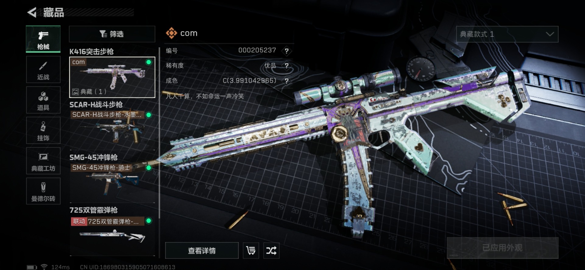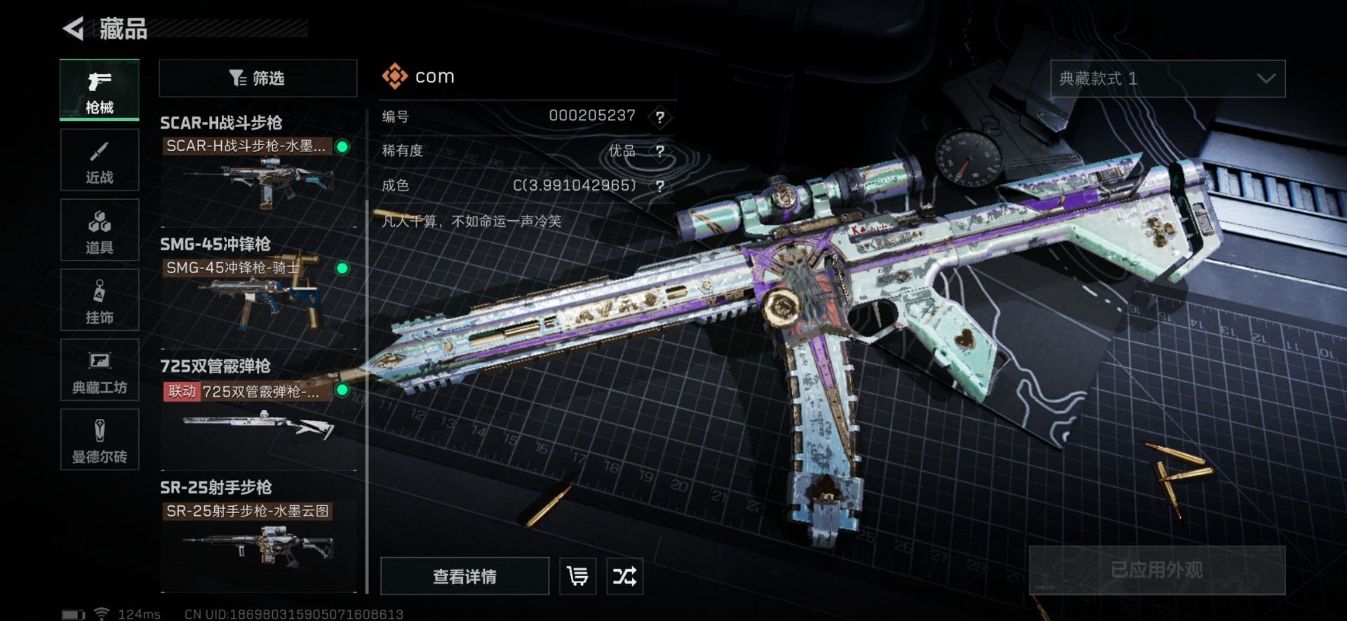 [11601664]可二次 可修改实名 实名:可修改 高级安全箱(9.17到期)总资产:17.2 哈夫币:4.103 传说武器皮肤:近战-北极星,K416突击步枪-命运(典藏),SCAR-H战斗步枪-水墨云图,SR-25射手步枪-水墨云图,SMG45冲锋枪-骑士 干员外观:骇爪-水墨云图