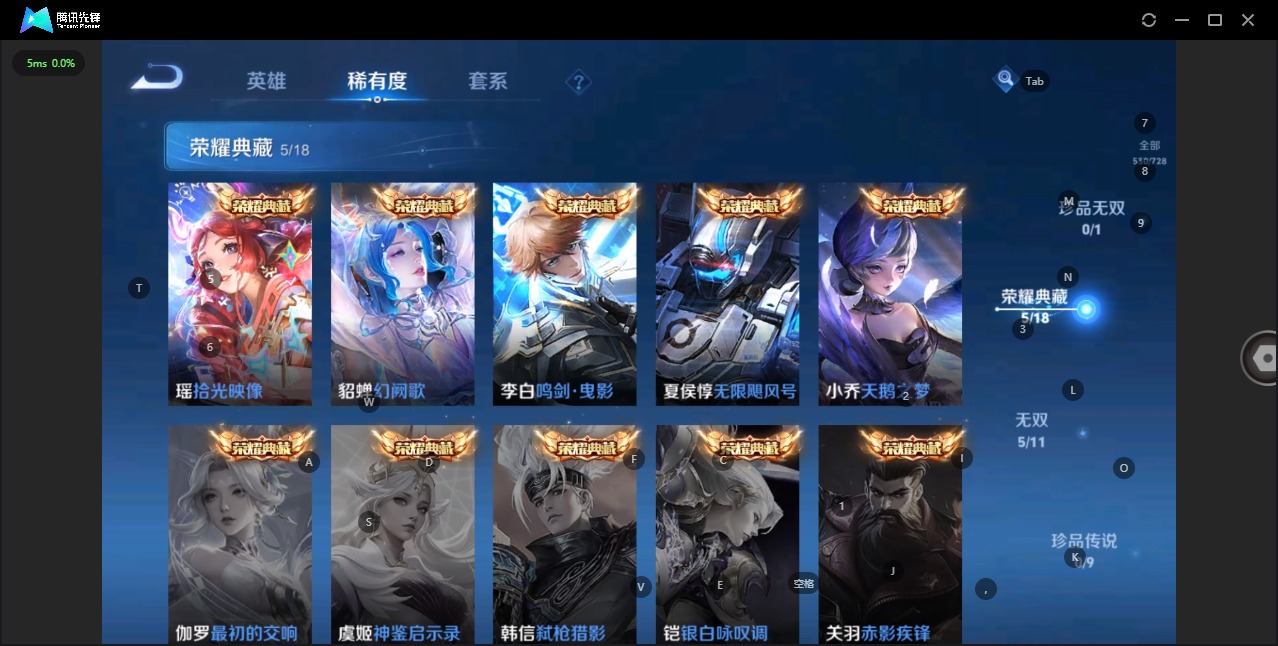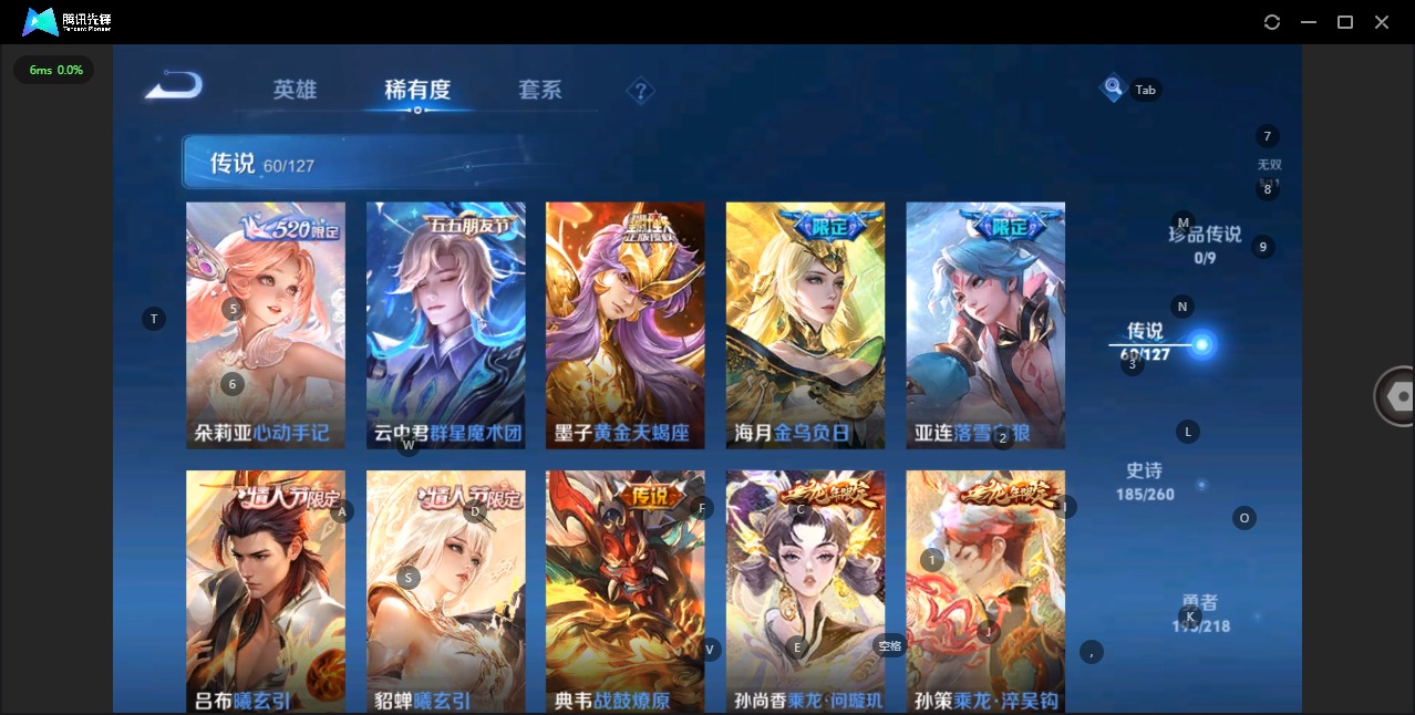 - PX_2103100-Q/无双王者/291皮肤/124英雄/2典藏/0珍品无双/1无双/0珍品传说/27传说/85史诗/8稀有英雄 【2 典藏皮肤】鸣剑·曳影 李白,九霄神辉 花木兰, 【1 无双皮肤】器灵·螭龙剑 曜, 【27 传说皮肤】鹤归松栖 云缨,启明星使 虞姬,前尘镜 娜可露露,逐花归海 澜,无双飞将 马超,李逍遥 曜,云鹰飞将 曜,齐天大圣 孙悟空,诗剑行 李白,浮生妄 夏洛特,地狱