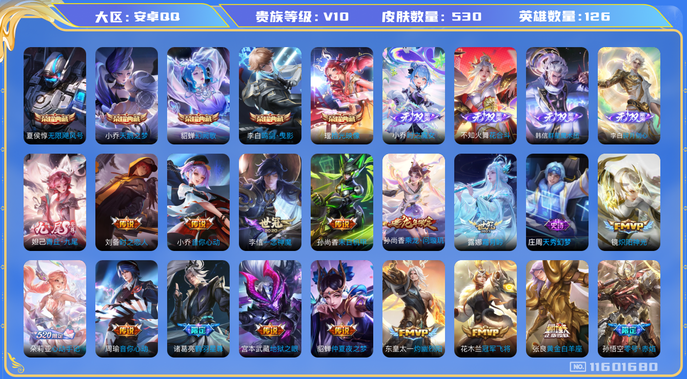 [11601680]V10 5典藏 5无双 60传说 126英雄 530皮肤 典藏英雄武则天 可修改实名 优质装备:天鹅之梦(小乔典藏),无限飓风号(高达),鸣剑·曳影,幻阙歌(貂蝉典藏),青丘·九尾(妲己无双),碎月剑心(李白无双),小乔时之魔女(小乔无双),韩信群星魔术团(韩信无双),花合斗,拾光映像(瑶典藏),黄金狮子座,黄金射手座,冠军飞将,云鹰飞将(小将军),黄金白羊座,久胜战神,炽阳神光,一念神魔,云霓雀翎,末日机甲-孙尚香(绿蚂蚱),地狱火,仲夏夜之梦(大飞蛾),音你心动-小乔,零号·赤焰,海洋之心,地狱之眼,飞鸢探春,音你心动-周瑜,胖达荣荣,李逍遥,乞巧织情,时之恋人-刘备(电焊工),游龙清影(小青龙),淬星耀世,超时空战士-狄仁杰,挚爱之约,挚爱花嫁,无双飞将,碎云,天秀幻梦,青丘·九尾,鹤羽星尊,灼幽烈阳,霜月吟,澜逐花归海,艾琳觅芳踪,琥珀纪元铠,琥珀纪元马超,金乌负日,黄金天蝎座,云中君群星魔术团,朵莉亚心动手记 传说皮:乘龙·问璇玑(孙尚香年限),乘龙·铭钟鼎(赵云年限),乘龙·淬吴钩(孙策年限),貂蝉曦玄引,吕布曦玄引,典韦战鼓燎原,落雪白狼 珍宝阁皮:万物之道,优雅恋人,蔷薇恋人,女武神 限定皮:至尊宝,白虎志(电光耗子),凤求凰(白切鸡),凤凰于飞,太华(伽罗年限),梅西,武陵仙君(小桃花),异界灵契(白毛香),寅虎·展翼(孙膑年限),前尘镜,星穹之声,时之彼端,白鹤梁神女,魔法小厨娘,白晶晶,时雨天司(水龙头),神威(电光马子),飞衡(韩信年限),玄嵩(庄周年限),瑞麟志(木兰年限),遇见飞天,高山流水,诗剑行,五谷丰年,青龙志(铠年限),冰锋战神,幽恒(沐浴露),武圣,天狼运算者,游园惊梦,梁祝,御风骁将(吕布年限),天狼狩猎者,龙胆,烈魂,岱宗(典韦年限),天狼溯光者,虎魄,奔雷神使(牛魔年限),李小龙,逐梦之光,玄武志(苏烈年限),朱雀志(守约年限),辉光之辰,如梦令-嫦娥,如梦令-后羿,霸王别姬-项羽,默契交锋-花木兰,孙行者,猪悟能,一生所爱,大圣娶亲,引擎之心,天魔缭乱,冰霜恋舞曲,云端筑梦师,乒乒小将,蜜橘之夏,神奇女侠,美猴王,匿光追影者,女儿国国王,寅虎·御盾(廉颇年限),寅虎·心曲(虎婆),寅虎·赤拳(老虎年限),玉兔公主,唐三藏 史诗皮:化蝶舞,星界战将,灵蛊蚀心,龙之律动,石田雨龙,茶境仙,海诺心动手记,芈月浮光幕影,怒海