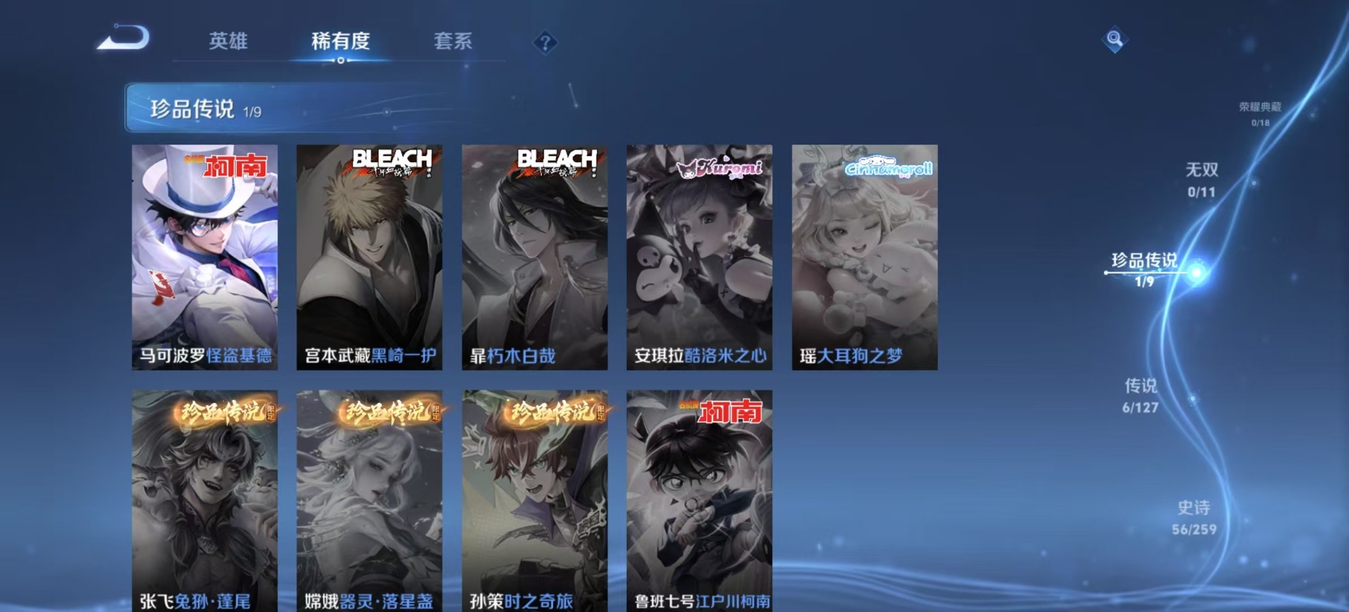 - [11687660]V6 1典藏 1珍品传说 5传说 125英雄 187皮肤 可修改实名 优质装备:幻阙歌(貂蝉典藏),一念神魔 珍品传说:兔狲·蓬尾 传说皮:幻光神枪 珍宝阁皮:妄想食味 限定皮:愿照·九州拓(澜年限),愿照·山河定(司空震年限),逐霄战戟,鸣野蒿,孙行者 史诗皮:器灵·浮梦炉,化蝶舞,龙之律动,雪豹·霜爪,茶境仙,炽弈燎原,破空之剑,战舞者,蒙犽顽岩魄,决胜骁骑,蔬乡物语(鲁班七号),百相守梦-百里守约,百相守梦-黄忠,织梦人,特工魅影,千年之狐,江河有灵,百解令(蒙犽),高渐离燃音魔法,青蛇,末日机甲-吕布,猫狗日记-孙策,女仆咖啡,水果甜心,星夜王子,功夫厨神,幽灵船长,鬼剑武藏,心灵战警,舞动绿茵,纤云弄巧,拒霜思,逐浪之夏,水晶猎龙者,曙光守护者,圣诞恋歌,鹰眼统帅,魅力维加斯,未来纪元-赵云