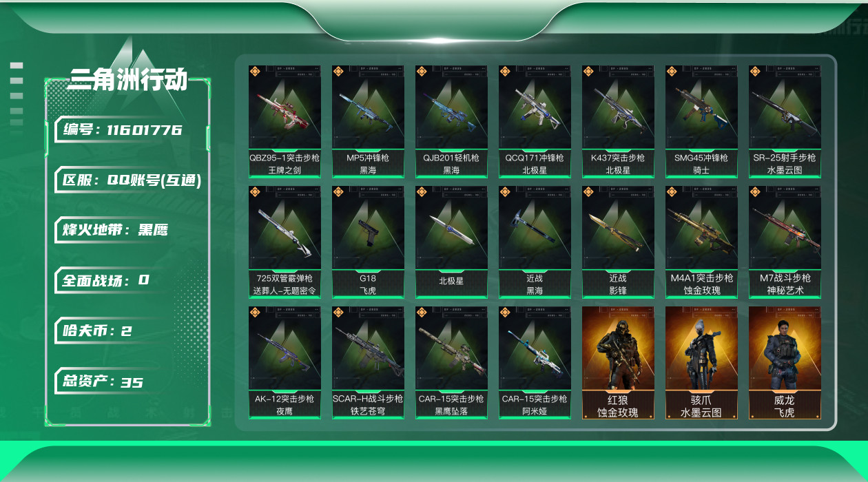 [11601776]总资产:35.3 5干员外观 3近战传说 18传说枪械 顶级安全箱(3×3)9.15号到期 可二次 可修改实名 烽火地带段位:黑鹰 全面战场段位:上等兵 哈夫币:2.457 传说武器皮肤:近战-影锋,近战-黑海,近战-北极星,QBZ95-1突击步枪-王牌之剑(典藏),SR-25射手步枪-水墨云图,SCAR-H战斗步枪-铁艺苍穹,AK-12突击步枪-夜鹰,SMG45冲锋枪-骑士,QJB201轻机枪-黑海,MP5冲锋枪-黑海,CAR-15突击步枪-阿米娅,725双管霰弹枪-送葬人-无题密令,QCQ171冲锋枪-北极星,K437突击步枪-北极星,G18-飞虎,M4A1突击步枪-蚀金玫瑰,M7战斗步枪-神秘艺术,CAR-15突击步枪-黑鹰坠落 干员外观:红狼-蚀金玫瑰,威龙-壮志凌云,骇爪-水墨云图,威龙-飞虎,露娜-黑·天际线