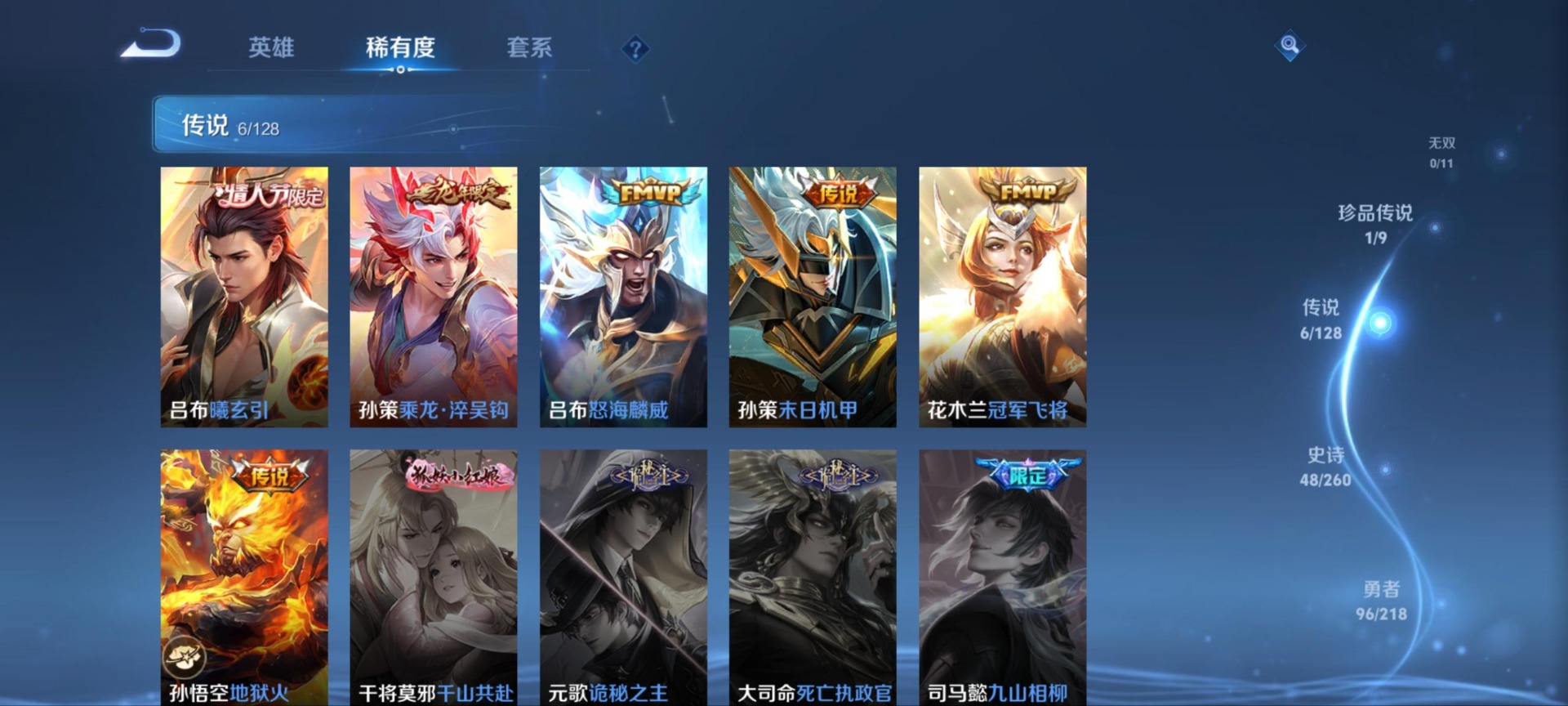 - PX_2083224-45 安卓QQ/最强王者/308皮肤/122英雄/1典藏/0珍品无双/0无双/0珍品传说/16传说/79史诗/8稀有英雄 【1 典藏皮肤】弑枪猎影 韩信, 【16 传说皮肤】启明星使 虞姬,逐花归海 澜,李逍遥 曜,云鹰飞将 曜,齐天大圣 孙悟空,猫影幻舞 貂蝉,仲夏夜之梦 貂蝉,地狱之眼 宫本武藏,武陵仙君 诸葛亮,时之恋人 刘备,末日机甲 孙尚香,一念神魔 李信,超时空