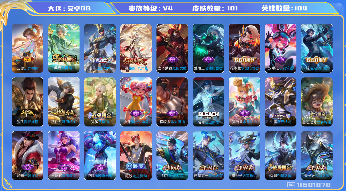 [11601878]V4 3传说 104英雄 101皮肤 可修改实名 传说皮:幻光神枪 限定皮:愿照·九州拓(澜年限),逐霄战戟,鸣野蒿 史诗皮:茶境仙,龙之律动,石田雨龙,星界战将,蔬乡物语(鲁班七号),偶像歌手,乱世虎臣,水果甜心,心灵骇客,功夫厨神,暗隐猎兽者,鬼剑武藏,乐园奇幻夜,缤纷独角兽,水晶猎龙者,曙光守护者,圣诞狂欢,鹰眼统帅