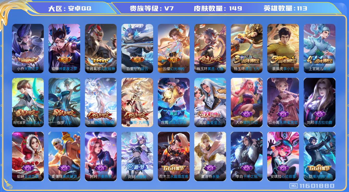 [11601880]V7 1典藏 7传说 113英雄 149皮肤 可修改实名 优质装备:天鹅之梦(小乔典藏),久胜战神,仲夏夜之梦(大飞蛾),碎云 传说皮:幻光神枪 珍宝阁皮:优雅恋人 限定皮:愿照·九州拓(澜年限),愿照·千秋盛(女娲年限),太华(伽罗年限),遇见飞天,梁祝,李小龙,真爱至上,云端筑梦师,寅虎·心曲(虎婆),山海·玄木吟(马可年限) 史诗皮:鸭鸭历险记-刘禅,化蝶舞,茶境仙,遇见神鹿,紫霞仙子,千年之狐,永昼,偶像歌手,魅语,无限星赏官,晚萤,猫狗日记-孙策,猫狗日记-大乔,节奏热浪,修罗,女仆咖啡,水果甜心,天才门将,心灵骇客,德古拉伯爵,心灵战警,天秀·启明,地狱岩魂,纤云弄巧,繁星吟游(呼啦呼啦),拒霜思,缤纷独角兽,乘风破浪,逐浪之夏,水晶猎龙者,曙光守护者,金属风暴,圣诞狂欢,圣诞恋歌,鹰眼统帅,暗夜贵公子,魅力维加斯