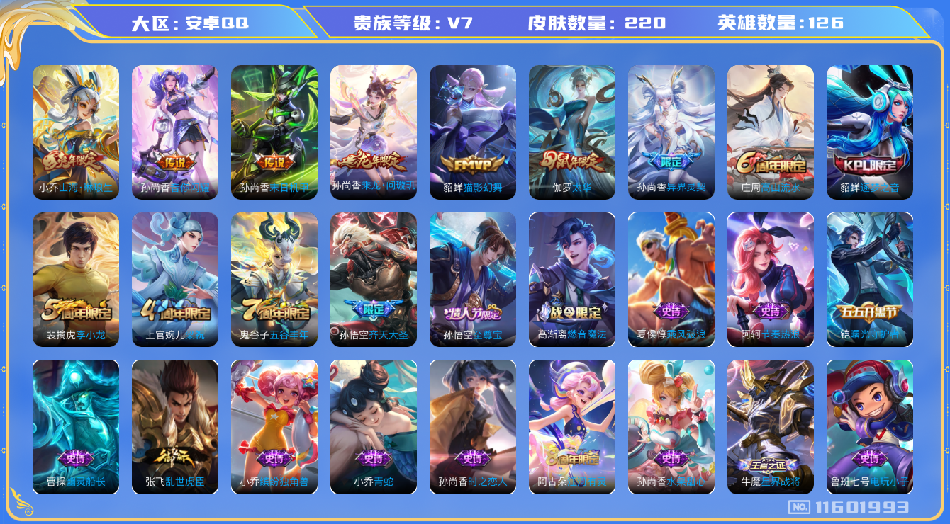 [11601993]V7 8传说 126英雄 220皮肤 典藏英雄武则天 可修改实名 优质装备:猫影幻舞,末日机甲-孙尚香(绿蚂蚱),音你闪耀(rap皮),山海·琳琅生(小乔年限) 传说皮:乘龙·问璇玑(孙尚香年限) 珍宝阁皮:蔷薇恋人,女武神 限定皮:至尊宝,太华(伽罗年限),异界灵契(白毛香),高山流水,齐天大圣,五谷丰年,梁祝,逐梦之音,李小龙 史诗皮:星界战将,电玩小子(小书包),电玩·爆裂旋风,江河有灵,高渐离燃音魔法,蒙恬荣光圣徽,冰冠公主,青蛇,末日机甲-吕布,时之恋人-孙尚香,乱世虎臣,节奏热浪,摇滚巨星,水果甜心,星夜王子,功夫厨神,暗隐猎兽者,幽灵船长,鬼剑武藏,缤纷独角兽,乘风破浪,逐浪之夏,曙光守护者,金属风暴,原初追逐者,圣诞恋歌,鹰眼统帅,魅力维加斯,黎明之约