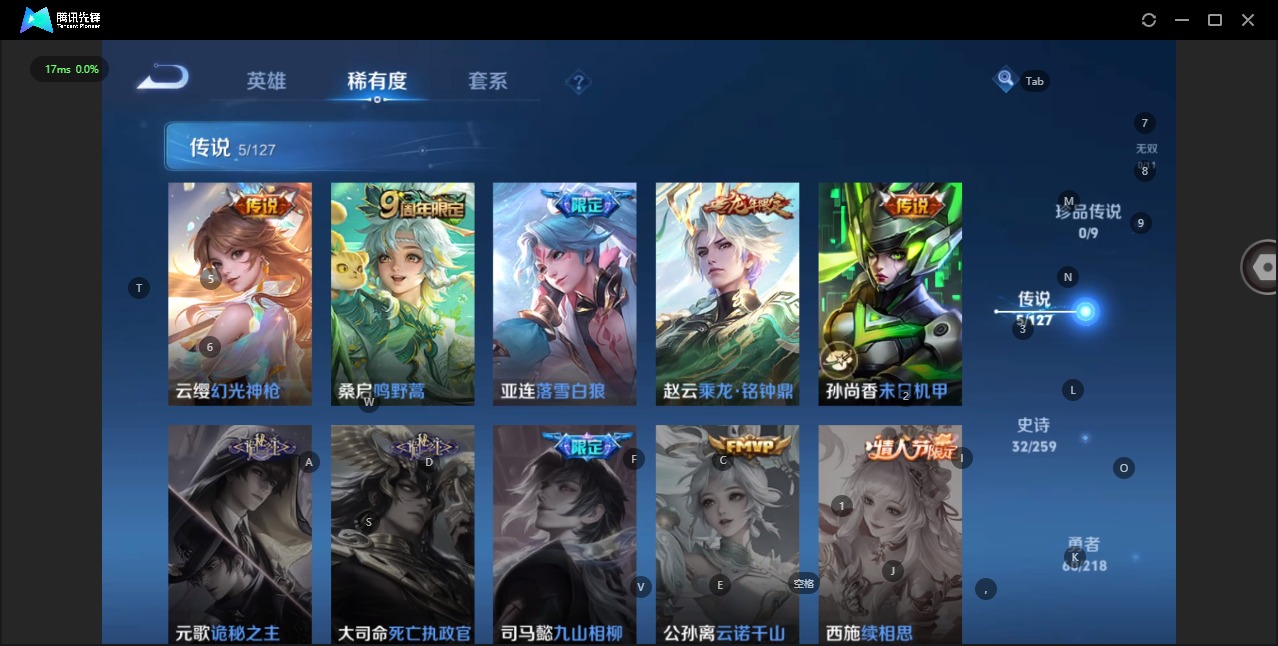 - [11410331]V5 4传说 121英雄 140皮肤 可修改实名 优质装备:末日机甲-孙尚香(绿蚂蚱),燃星之曲,鹤羽星尊 限定皮:逐霄战戟,齐天大圣,梁祝,李小龙,大圣娶亲 史诗皮:星界战将,苍穹之光,特工魅影,偶像歌手,暗夜猫娘,猫狗日记-大乔,水果甜心,天才门将,鬼剑武藏,纤云弄巧,繁星吟游(呼啦呼啦),乘风破浪,水晶猎龙者,鹰眼统帅,魅力维加斯,未来纪元-赵云