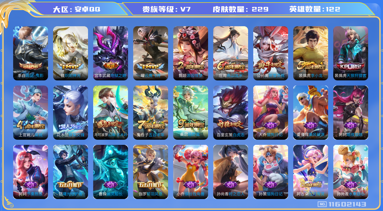 [11602143]V7 1典藏 6传说 122英雄 229皮肤 可修改实名 荣耀水晶:鸣剑·曳影 传说皮:地狱之眼,云鹰飞将(小将军),炽阳神光 珍宝阁皮:妄想食味,蔷薇恋人,女武神 限定皮:鸣野蒿,白虎志(电光耗子),高山流水,五谷丰年,游园惊梦,梁祝,天狼狩猎者,祈雪灵祝(雪兔子),李小龙,默契交锋-花木兰,山海·玄木吟(马可年限) 史诗皮:星界战将,蒙犽顽岩魄,超元猎域,电玩小子(小书包),黄金分割率,特工魅影,千年之狐,江河有灵,蒙恬荣光圣徽,冰冠公主,偶像歌手,魅语,电玩·爆裂旋风,暗夜猫娘,末日机甲-吕布,猫狗日记-孙策,猫狗日记-大乔,时之恋人-孙尚香,节奏热浪,修罗,女仆咖啡,水果甜心,绅士熊喵,星夜王子,暗隐猎兽者,幽灵船长,鬼剑武藏,舞动绿茵,纤云弄巧,繁星吟游(呼啦呼啦),拒霜思,缤纷独角兽,乘风破浪,逐浪之夏,水晶猎龙者,曙光守护者,热力回旋,箭羽风息,金属风暴,原初追逐者,圣诞狂欢,圣诞恋歌,鹰眼统帅,黎明之约,赏金猎手,无心,未来纪元-赵云