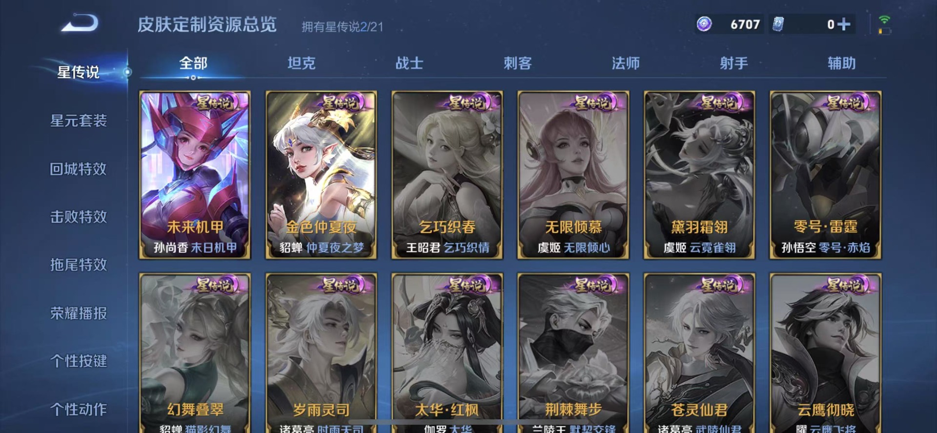 高渐离燃音魔法,刘邦德古拉伯爵,夏侯惇乘风破浪,阿轲暗夜猫娘,阿轲节奏热浪,铠曙光守护者,曹操幽灵船长,伽罗箭羽风息,廉颇地狱岩魂,小乔缤纷独角兽,孙策猫狗日记,不知火舞魅语,鲁班七号电玩小子,项羽苍穹之光,吕布圣诞狂欢,露娜紫霞仙子,吕布末日机甲,诸葛亮黄金分割率,司马懿暗渊魔法,刘禅天才门将,刘禅绅士熊喵,宫本武藏鬼剑武藏,兰陵王暗隐猎兽者,貂蝉圣诞恋歌,花木兰水晶猎龙者,李白千年之狐,夏洛特永昼,安琪拉心灵骇客,蒙犽百解令,安琪拉时之奇旅,白起星夜王子,亚瑟心灵战警,嬴政摇滚巨星,程咬金功夫厨神,百里玄策原初追逐者,雅典娜冰冠公主,雅典娜黎明之约,韩信白龙吟,李元芳逐浪之夏,百里守约特工魅影,墨子龙骑士,墨子金属风暴,蔡文姬舞动绿茵,澜赏金猎手,王昭君偶像歌手,橘右京修罗