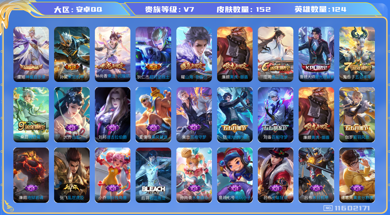 [11602171]V7 1典藏 5传说 124英雄 152皮肤 可修改实名 优质装备:神鉴启示录,超时空战士-狄仁杰,末日机甲-孙策,山海·苍雷引(电光曜子) 传说皮:乘龙·问璇玑(孙尚香年限) 珍宝阁皮:万物之道,玩趣恶龙 限定皮:鸣野蒿,高山流水,五谷丰年,寅虎·御盾(廉颇年限),匿光启智者 史诗皮:鸭鸭历险记-刘禅,灵蛊蚀心,龙之律动,石田雨龙,蒙犽顽岩魄,百相守梦-黄忠,电玩小子(小书包),黄金分割率,特工魅影,千年之狐,永昼,百相守梦(刘备),白蛇,晚萤,末日机甲-吕布,乱世虎臣,修罗,摇滚巨星,水果甜心,天才门将,星夜王子,心灵骇客,功夫厨神,德古拉伯爵,暗隐猎兽者,鬼剑武藏,心灵战警,地狱岩魂,缤纷独角兽,乘风破浪,逐浪之夏,水晶猎龙者,曙光守护者,箭羽风息,金属风暴,圣诞狂欢,圣诞恋歌,鹰眼统帅,魅力维加斯,寅虎·御盾,无心,未来纪元-赵云