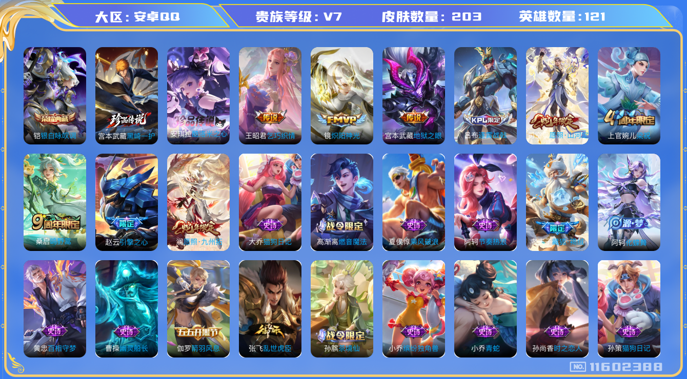 [11602388]V7 1典藏 2珍品传说 6传说 121英雄 203皮肤 可修改实名 荣耀水晶:银白咏叹调(倪克斯侍卫) 珍品传说:酷洛米之心,黑崎一护 传说皮:地狱之眼,炽阳神光,乞巧织情 珍宝阁皮:蔷薇恋人 限定皮:愿照·九州拓(澜年限),愿照·山河定(司空震年限),逐霄战戟,鸣野蒿,梁祝,引擎之心 史诗皮:茶境仙,糖绘人间,鸭鸭历险记-刘禅,龙之律动,雪豹·霜爪,藏狐·褐绒,石田雨龙,百相守梦-百里守约,百相守梦-黄忠,埋骨钱,乘龙·聚宝船(安琪拉年限),炽弈燎原,化蝶舞,破空之剑,电玩小子(小书包),白龙吟,黄金分割率,特工魅影,千年之狐,江河有灵,高渐离燃音魔法,百解令(蒙犽),冰冠公主,青蛇,偶像歌手,电玩·爆裂旋风,末日机甲-吕布,猫狗日记-孙策,猫狗日记-大乔,时之恋人-孙尚香,乱世虎臣,节奏热浪,女仆咖啡,水果甜心,绅士熊喵,星夜王子,心灵骇客,暗隐猎兽者,幽灵船长,鬼剑武藏,心灵战警,舞动绿茵,纤云弄巧,拒霜思,缤纷独角兽,乘风破浪,逐浪之夏,水晶猎龙者,箭羽风息,金属风暴,圣诞恋歌,鹰眼统帅,魅力维加斯,未来纪元-赵云