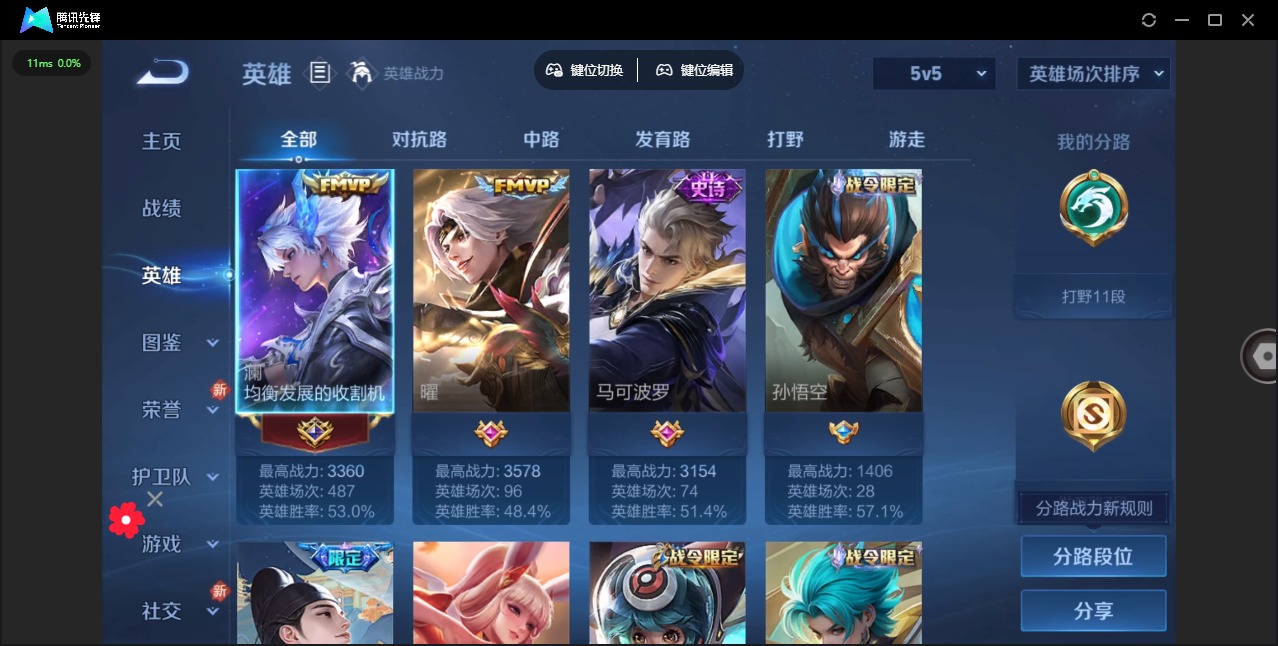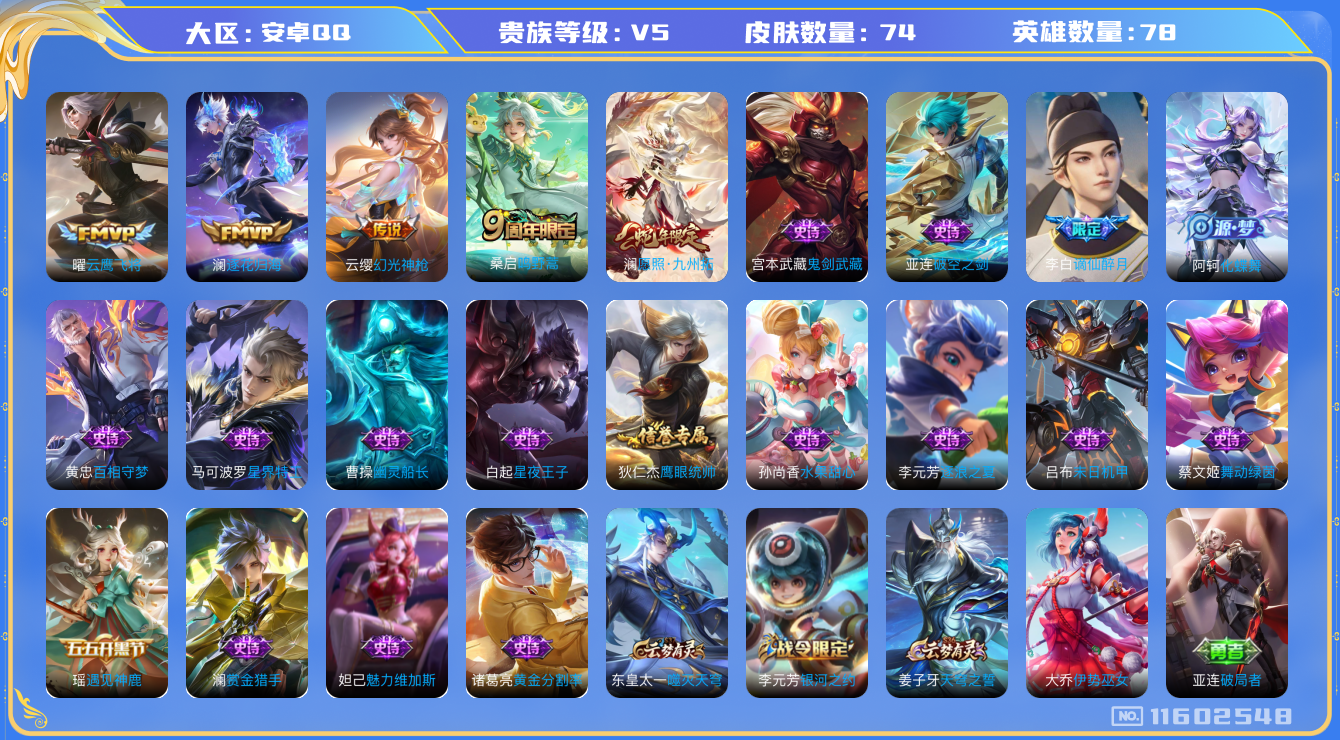 [11602548]V5 5传说 78英雄 74皮肤 可修改实名 优质装备:云鹰飞将(小将军),澜逐花归海 传说皮:幻光神枪 限定皮:愿照·九州拓(澜年限),鸣野蒿 史诗皮:化蝶舞,谪仙醉月,破空之剑,星界特工,百相守梦-黄忠,遇见神鹿,黄金分割率,末日机甲-吕布,水果甜心,星夜王子,幽灵船长,鬼剑武藏,舞动绿茵,逐浪之夏,鹰眼统帅,魅力维加斯,赏金猎手