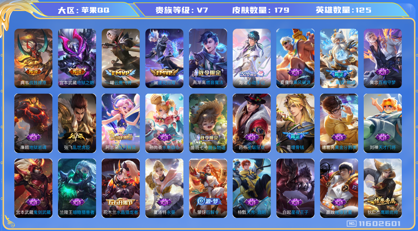 - [11884062]V7 1典藏 9传说 125英雄 235皮肤 可修改实名 优质装备:神鉴启示录,冠军飞将,炽阳神光,音你心动-小乔,胖达荣荣,大乔-时之奇旅 珍宝阁皮:蔷薇恋人,女武神 限定皮:凤凰于飞,星穹之声,白鹤梁神女,山海·碧波行(瑶年限),遇见飞天,诗剑行,无限倾心-虞姬,五谷丰年,梁祝,孙行者,乒乒小将,女儿国国王,时之祈愿-瑶(瑶传限),匿光启智者,时之奇旅-妲己,山海·玄木吟(马可年限) 史诗皮:化蝶舞,琥珀纪元伽罗,遇见神鹿,紫霞仙子,苍穹之光,黄金分割率,江河有灵,匿光侦查者,雪夜绮愿(周瑜),百解令(蒙犽),高渐离燃音魔法,蒙恬荣光圣徽,无限星赏官,匿光破解者,青蛇,晚萤,电玩·爆裂旋风,猫狗日记-孙策,时之恋人-孙尚香,乱世虎臣,女仆咖啡,水果甜心,天才门将,时之奇旅-安琪拉,功夫厨神,暗隐猎兽者,幽灵船长,鬼剑武藏,地狱岩魂,纤云弄巧,繁星吟游(呼啦呼啦),拒霜思,逐浪之夏,水晶猎龙者,曙光守护者,箭羽风息,金属风暴,圣诞狂欢,圣诞恋歌,鹰眼统帅,暗夜贵公子,魅力维加斯,奇遇舞章,天秀·音浪,无心