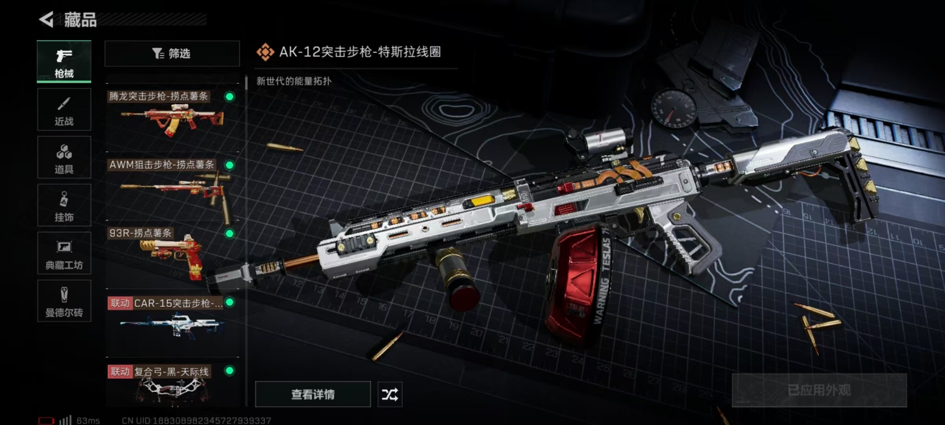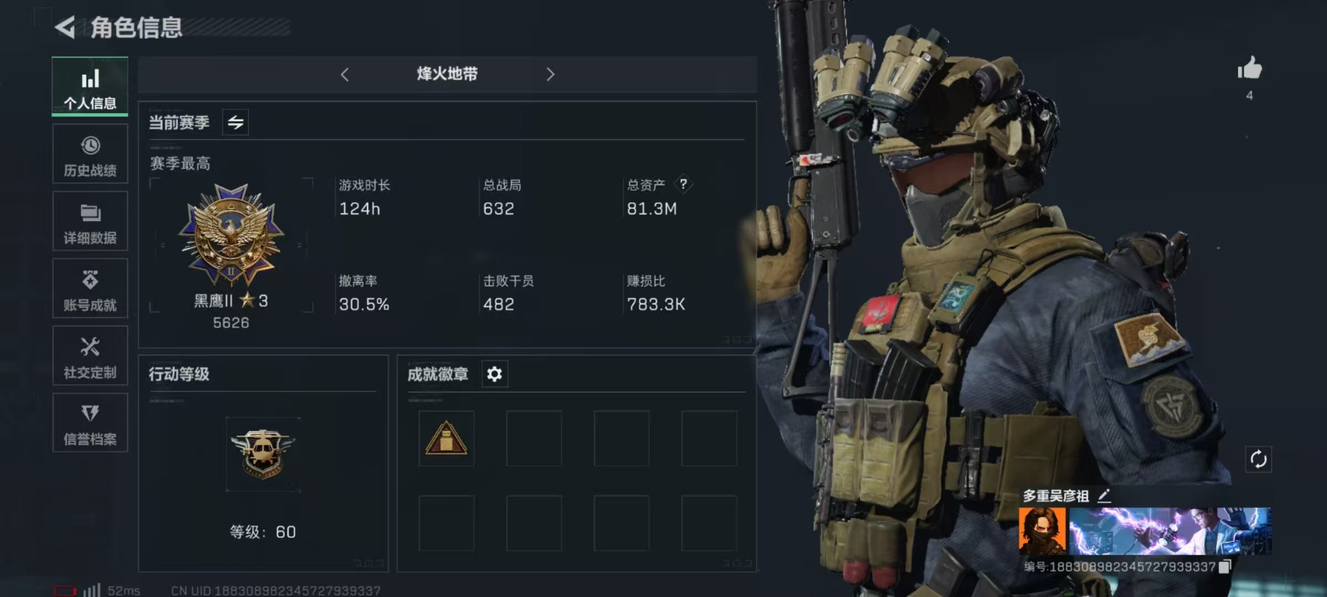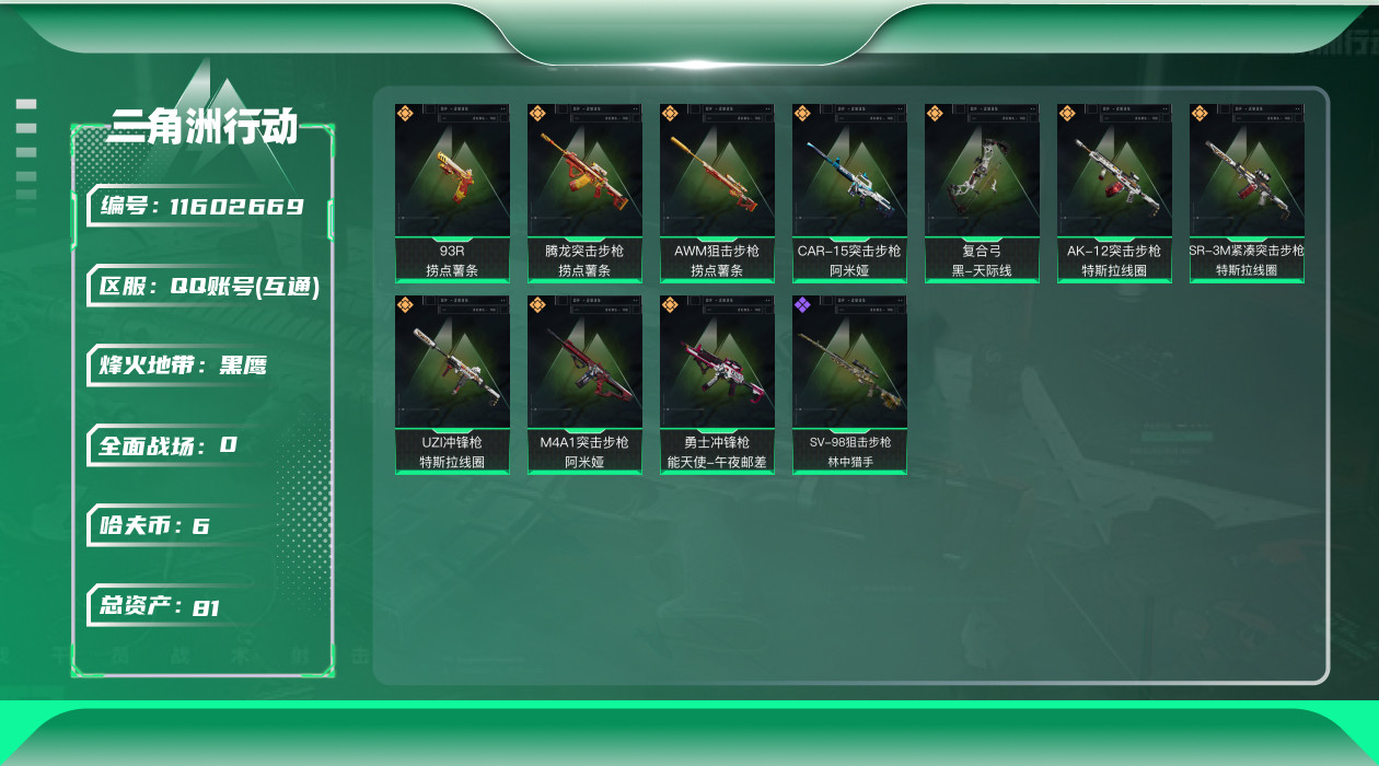 [11602669]总资产:81.3M 10传说枪械 哈夫币:6.113K 可二次 可修改实名 烽火地带段位:黑鹰 全面战场段位:尉官 传说武器皮肤:M4A1突击步枪-阿米娅,CAR-15突击步枪-阿米娅,复合弓-黑-天际线,AWM狙击步枪-捞点薯条,腾龙突击步枪-捞点薯条,93R-捞点薯条,AK-12突击步枪-特斯拉线圈,SR-3M紧凑突击步枪-特斯拉线圈,UZI冲锋枪-特斯拉线圈,勇士冲锋枪-能天使-午夜邮差 史诗武器皮肤:SV-98狙击步枪-林中猎手