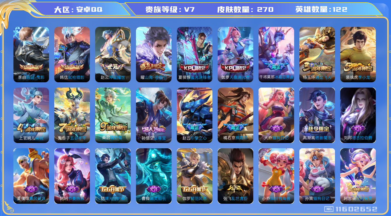 [11602652]V7 2典藏 4传说 122英雄 270皮肤 可修改实名 荣耀水晶:鸣剑·曳影,弑枪猎影(韩信典藏) 传说皮:淬星耀世,山海·苍雷引(电光曜子) 珍宝阁皮:女武神,玩趣恶龙 限定皮:鸣野蒿,至尊宝,遇见飞天,匿光决锋者,五谷丰年,梁祝,天狼溯光者,李小龙,引擎之心,冰霜恋舞曲,枫霜尽 史诗皮:紫霞仙子,电玩小子(小书包),白龙吟,黄金分割率,特工魅影,千年之狐,永昼,江河有灵,高渐离燃音魔法,百解令(蒙犽),冰冠公主,偶像歌手,电玩·爆裂旋风,百相守梦(关羽),龙骑士(小龙虾),末日机甲-吕布,猫狗日记-孙策,猫狗日记-大乔,乱世虎臣,节奏热浪,女仆咖啡,摇滚巨星,水果甜心,绅士熊喵,天才门将,星夜王子,心灵骇客,功夫厨神,德古拉伯爵,暗隐猎兽者,幽灵船长,鬼剑武藏,心灵战警,舞动绿茵,纤云弄巧,繁星吟游(呼啦呼啦),拒霜思,缤纷独角兽,乘风破浪,逐浪之夏,水晶猎龙者,曙光守护者,箭羽风息,金属风暴,圣诞狂欢,圣诞恋歌,鹰眼统帅,暗夜贵公子,魅力维加斯,无心,未来纪元-赵云