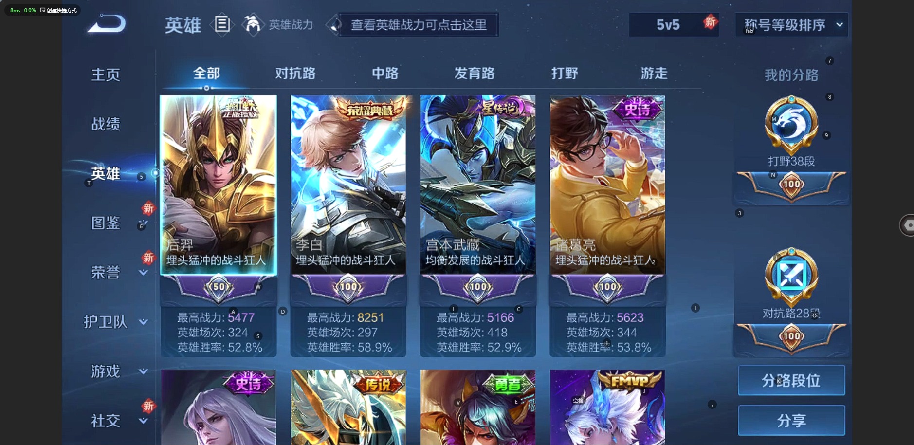 - [9736812]王者荣耀-安卓QQ 贵族贵5 星元皮肤1 传说皮肤4 史诗皮肤26 皮肤数量153 皮肤价值:83544 英雄124 至尊星耀II 总场次3381 【内测皮肤】1 孙尚香_蔷薇恋人【星元皮肤】1 幽冥之眼 【传说皮肤】4 嬴政_玄雷天君 澜_愿照九州拓 桑启_鸣野蒿 宫本武藏_地狱之眼 【史诗皮肤】26 阿轲_化蝶舞 牛魔_星界战将 狂铁_龙之律动 赵云_皇家上将 孙悟空_至尊宝 花木兰_水晶猎龙者 上官婉儿_梁祝 阿轲_迷踪丽影 阿轲_节奏热浪 程咬金_功夫厨神 刘禅_天才门将 蔡文姬_舞动绿茵 兰陵王_暗隐猎兽者 夏侯惇_乘风破浪 貂蝉_圣诞恋歌 露娜_紫霞仙子 吕布_圣诞狂欢 孙尚香_水果甜心 项羽_苍穹之光 赵云_未来纪元 甄姬_冰雪圆舞曲 蒙犽_百解令 云中君_纤云弄巧 蔡文姬_繁星吟游 狄仁杰_鹰眼统帅 【其他皮肤】123 露娜_命运加冕 戈娅_玫蓝誓约 达摩_爆裂喵拳 少司缘_灵卦秘语 东皇太一_金福满堂 西施_雪境奇遇 太乙真人_谧流熔炉 影_魅影绮裳 典韦_铁骨偃魂 苍_苍林狼骑 东皇太一_噬灭天穹 米莱狄_怪诞之夜 亚瑟_动物派对 姜子牙_天穹之誓 周瑜_熔金海岸 刘邦_剑破天穹 盘古_经纬探寻者 程咬金_无双福将 铠_龙域领主 阿古朵_布丁狗之约 钟馗_虚灵犬护 张良_灵野札记 雅典娜_潮玩士官长 小乔_秘证寻踪 项羽_海滩派对 钟无艳_春野之旅 刘邦_夺宝奇兵 鬼谷子_天穹祈灯 张良_古海寻踪 鲁班大师_探海日志 裴擒虎_擒涛扼浪