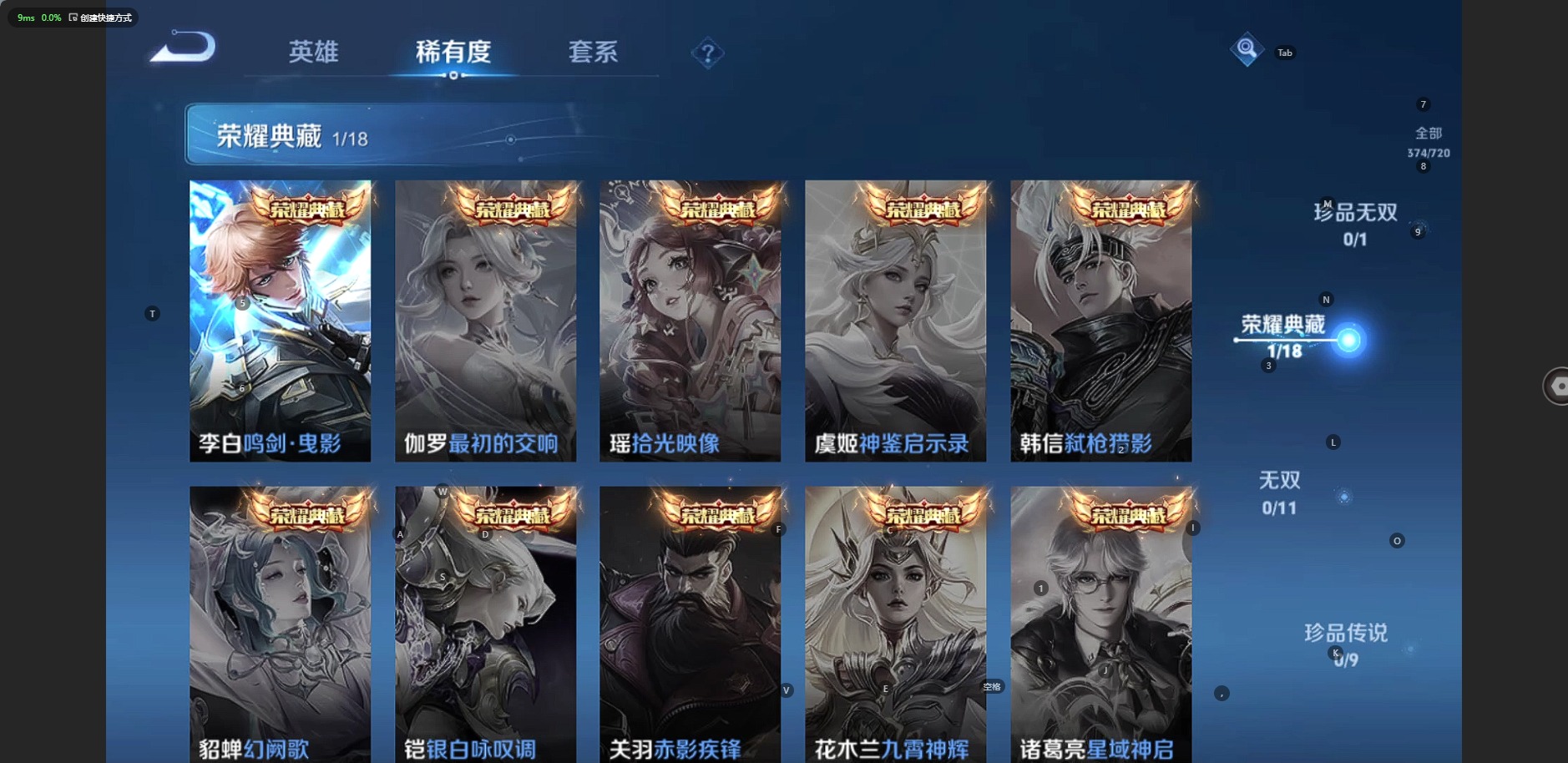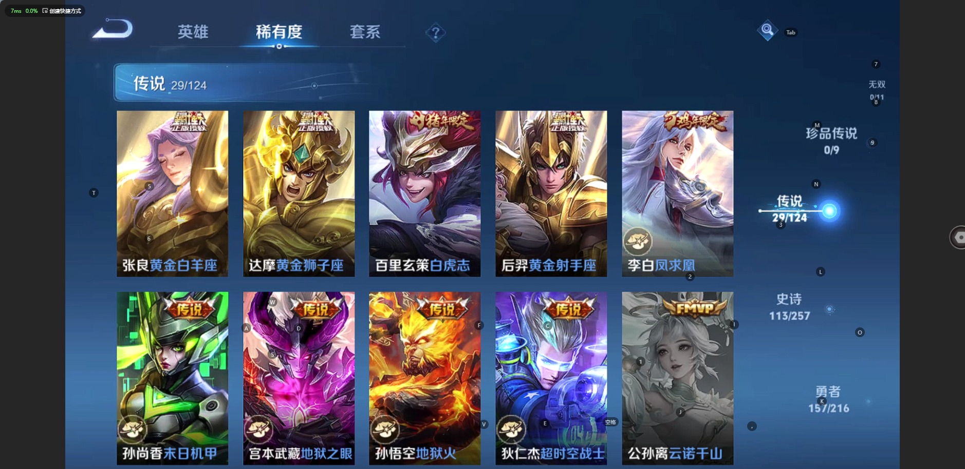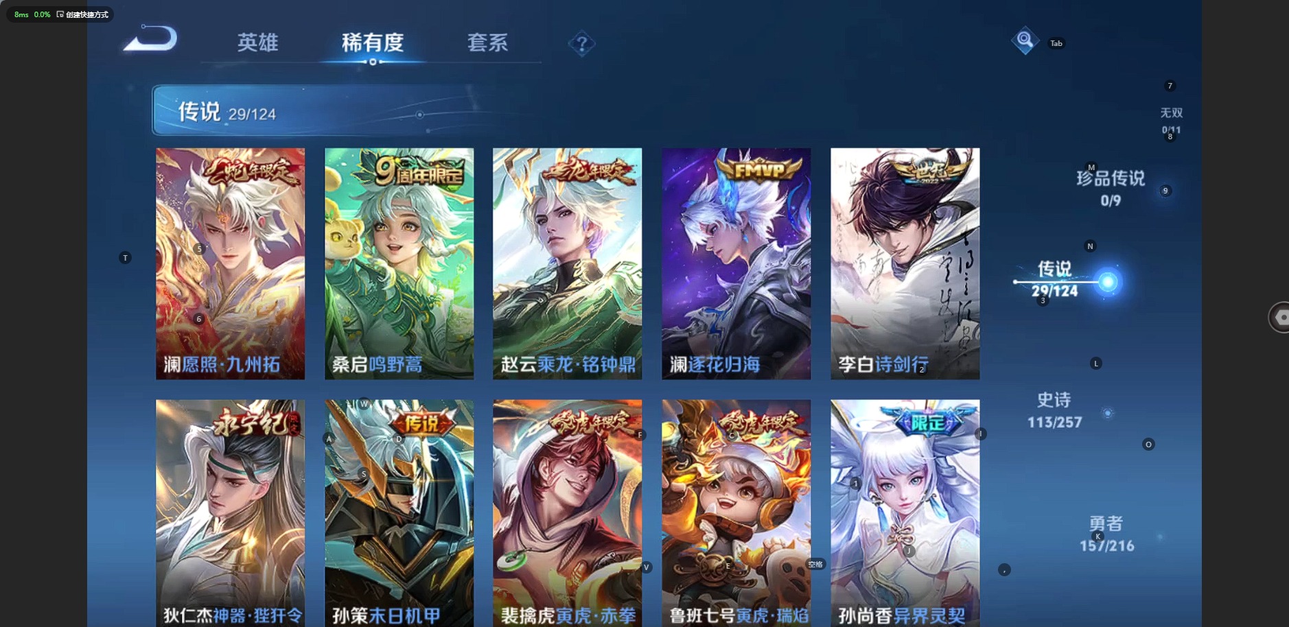 [11602718]V9 1典藏 29传说 124英雄 374皮肤 可修改实名 荣耀水晶:鸣剑·曳影 传说皮:乘龙·铭钟鼎(赵云年限),李逍遥,黄金狮子座,黄金射手座,黄金白羊座,零号·赤焰,地狱火,地狱之眼,末日机甲-孙尚香(绿蚂蚱),一念神魔,云鹰飞将(小将军),炽阳神光,音你心动-周瑜,绛天战甲(鸡嘴战神),超时空战士-狄仁杰,末日机甲-孙策,神器·狴犴令,澜逐花归海 珍宝阁皮:妄想食味,优雅恋人,玩趣恶龙 限定皮:愿照·九州拓(澜年限),鸣野蒿,至尊宝,白虎志(电光耗子),凤求凰(白切鸡),异界灵契(白毛香),傲雪梅枪,寅虎·展翼(孙膑年限),时雨天司(水龙头),神威(电光马子),飞衡(韩信年限),遇见飞天,高山流水,诗剑行,匿光决锋者,五谷丰年,冰锋战神,武圣,梁祝,御风骁将(吕布年限),天狼狩猎者,龙胆,天狼溯光者,李小龙,逐梦之影,朱雀志(守约年限),圣诞老人,默契交锋-花木兰,猪悟能,大圣娶亲,引擎之心,青春决赛季,寅虎·御盾(廉颇年限),寅虎·瑞焰(虎皮蛋子),寅虎·心曲(虎婆),寅虎·赤拳(老虎年限),时之祈愿-云中君 史诗皮:星界战将,龙之律动,芈月浮光幕影,蔬乡物语(鲁班七号),化蝶舞,破空之剑,紫霞仙子,苍穹之光,白龙吟,黄金分割率,特工魅影,千年之狐,永昼,蒙恬荣光圣徽,冰冠公主,偶像歌手,无限星赏官,魅语,白蛇,百相守梦(刘备),暗夜猫娘,龙骑士(小龙虾),末日机甲-吕布,猫狗日记-孙策,时之恋人-孙尚香,乱世虎臣,节奏热浪,修罗,女仆咖啡,摇滚巨星,水果甜心,绅士熊喵,天才门将,星夜王子,心灵骇客,功夫厨神,德古拉伯爵,暗隐猎兽者,幽灵船长,鬼剑武藏,暗渊魔法,心灵战警,舞动绿茵,地狱岩魂,纤云弄巧,缤纷独角兽,乘风破浪,逐浪之夏,月团寄思,水晶猎龙者,曙光守护者,箭羽风息,唤灵魅影,金属风暴,原初追逐者,圣诞狂欢,圣诞恋歌,鹰眼统帅,王者之锤,暗夜贵公子,魅力维加斯,黎明之约,赏金猎手,奇遇舞章,寅虎·御盾,无心,未来纪元-赵云