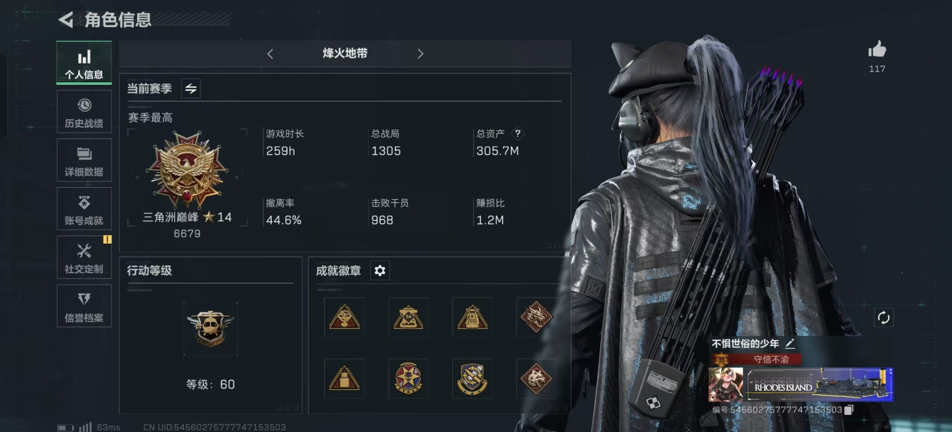 [11602918]总资产:305.7M 6干员外观 1近战传说 19传说枪械 哈夫币:9.955K 可二次 可修改实名 优质装备:近战-黑海,顶级安全箱(3x3) 烽火地带段位:三角洲巅峰 全面战场段位:上等兵 传说武器皮肤:AS Val突击步枪-蛇年祥瑞,SR-25射手步枪-水墨云图,AK-12突击步枪-夜鹰,SMG45冲锋枪-骑士,M4A1突击步枪-阿米娅,CAR-15突击步枪-阿米娅,复合弓-黑-天际线,AWM狙击步枪-捞点薯条,腾龙突击步枪-捞点薯条,93R-捞点薯条,勇士冲锋枪-能天使-午夜邮差,725双管霰弹枪-送葬人-无题密令,MP5冲锋枪-黑海,QJB201轻机枪-黑海,M7战斗步枪-维京,M4A1突击步枪-蚀金玫瑰,QBZ95-1突击步枪-破军,CAR-15突击步枪-黑鹰坠落 史诗武器皮肤:SR-3M紧凑突击步枪-英雄,M700狙击步枪-蝮蛇,G3战斗步枪-战场英杰,PKM通用机枪-守夜人,AS Val突击步枪-尖端治疗,M700狙击步枪-守夜人,SG552突击步枪-尖端治疗,SR-25射手步枪-尖端治疗,PKM通用机枪-荒野求生,勇士冲锋枪-深海恐惧,AKM突击步枪-林中猎手,.357左轮-幸运时刻,SR-3M紧凑突击步枪-荒野求生,M1014霰弹枪-林中猎手,SV-98狙击步枪-林中猎手,PTR-32突击步枪-英雄,SVD狙击步枪-荒野求生,M250通用机枪-囚徒,SV-98狙击步枪-囚徒,腾龙突击步枪-无垢,PSG-1射手步枪-无垢,M700狙击步枪-阿萨拉工艺,M14射手步枪-黑鹰坠落,沙漠之鹰-曙光,Vector冲锋枪-阿萨拉文明,SVD狙击步枪-阿萨拉工艺,PKM通用机枪-英雄,M700狙击步枪-竞技风,93R-博士 干员外观:威龙-铁面判官,红狼-蚀金玫瑰,牧羊人-街头之王,无名-夜鹰,蜂医-送葬人·无题密令(S5),露娜-黑·天际线