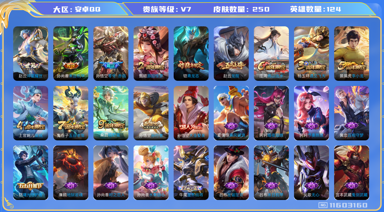 [11603160]V7 4传说 124英雄 250皮肤 可修改实名 优质装备:末日机甲-孙尚香(绿蚂蚱),零号·赤焰,淬星耀世 珍宝阁皮:妄想食味,蔷薇恋人 限定皮:鸣野蒿,遇见飞天,高山流水,五谷丰年,青龙志(铠年限),游园惊梦,梁祝,龙胆,李小龙,孙行者,大圣娶亲 史诗皮:星界战将,蒙犽顽岩魄,百相守梦-黄忠,特工魅影,千年之狐,蒙恬荣光圣徽,冰冠公主,暗夜猫娘,末日机甲-吕布,时之恋人-孙尚香,节奏热浪,摇滚巨星,水果甜心,心灵骇客,功夫厨神,暗隐猎兽者,鬼剑武藏,地狱岩魂,繁星吟游(呼啦呼啦),乘风破浪,逐浪之夏,曙光守护者,金属风暴,原初追逐者,圣诞狂欢,圣诞恋歌,鹰眼统帅,魅力维加斯,黎明之约,无心,未来纪元-赵云