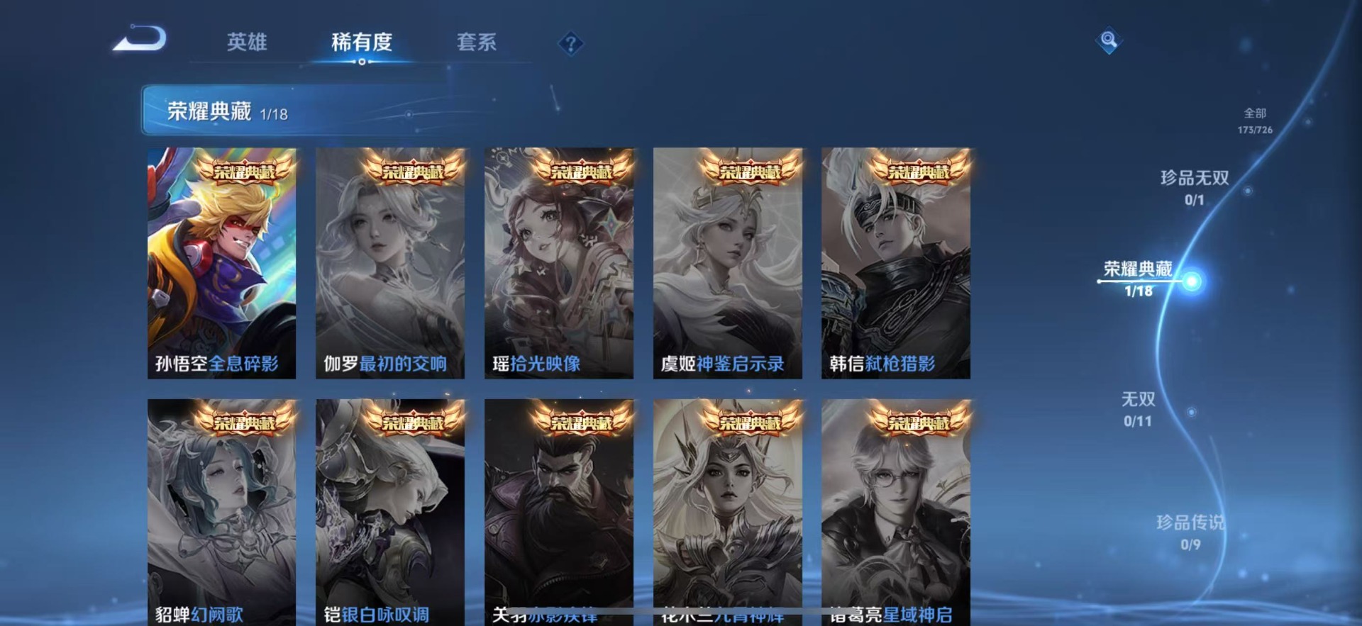 老夫子醍醐杖,苏烈千军破阵,达摩沙漠行僧,项羽苍威无极,镜青焰无极,兰陵王金庭之子,裴擒虎擒涛扼浪,鲁班大师探海日志,鬼谷子原初探秘者,张良古海寻踪,桑启海盐诗旅,狄仁杰万华元夜,程咬金演武夺筹,李元芳云中旅人,钟馗驱傩正仪