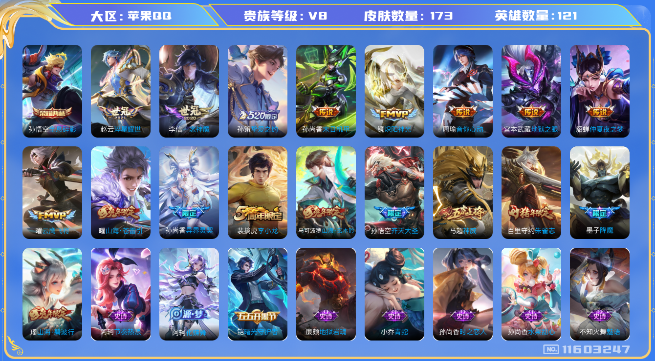 [11603247]V8 1典藏 13传说 121英雄 173皮肤 可修改实名 优质装备:全息碎影(猴子典藏),云鹰飞将(小将军),炽阳神光,一念神魔,末日机甲-孙尚香(绿蚂蚱),仲夏夜之梦(大飞蛾),地狱之眼,音你心动-周瑜,淬星耀世,挚爱之约,山海·苍雷引(电光曜子) 珍宝阁皮:玩趣恶龙 限定皮:异界灵契(白毛香),神威(电光马子),山海·碧波行(瑶年限),齐天大圣,降魔,李小龙,朱雀志(守约年限),山海·玄木吟(马可年限) 史诗皮:化蝶舞,电玩小子(小书包),黄金分割率,特工魅影,永昼,电玩·爆裂旋风,魅语,青蛇,偶像歌手,末日机甲-吕布,时之恋人-孙尚香,节奏热浪,修罗,女仆咖啡,水果甜心,时之奇旅-安琪拉,功夫厨神,鬼剑武藏,地狱岩魂,拒霜思,曙光守护者,金属风暴,鹰眼统帅,魅力维加斯,赏金猎手,无心,未来纪元-赵云