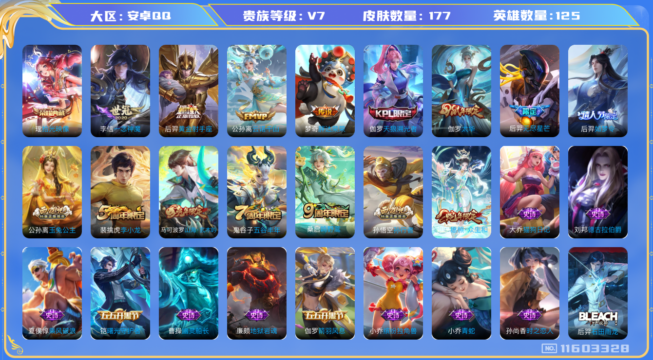 [11603328]V7 1典藏 8传说 125英雄 177皮肤 可修改实名 优质装备:拾光映像(瑶典藏),黄金射手座,一念神魔,胖达荣荣 传说皮:云诺千山 珍宝阁皮:胡桃夹子,女武神 限定皮:愿照·众生和(妲己年限),鸣野蒿,太华(伽罗年限),五谷丰年,天狼溯光者,李小龙,如梦令-后羿,孙行者,玉兔公主,无尽星芒,山海·玄木吟(马可年限) 史诗皮:器灵·浮梦炉,石田雨龙,紫霞仙子,电玩小子(小书包),黄金分割率,特工魅影,电玩·爆裂旋风,江河有灵,龙骑士(小龙虾),魅语,无限星赏官,青蛇,猫狗日记-大乔,时之恋人-孙尚香,女仆咖啡,摇滚巨星,水果甜心,心灵骇客,德古拉伯爵,暗隐猎兽者,幽灵船长,鬼剑武藏,地狱岩魂,繁星吟游(呼啦呼啦),拒霜思,缤纷独角兽,乘风破浪,逐浪之夏,水晶猎龙者,曙光守护者,箭羽风息,金属风暴,圣诞狂欢,圣诞恋歌,鹰眼统帅,暗夜贵公子,千筹问战,无心,未来纪元-赵云