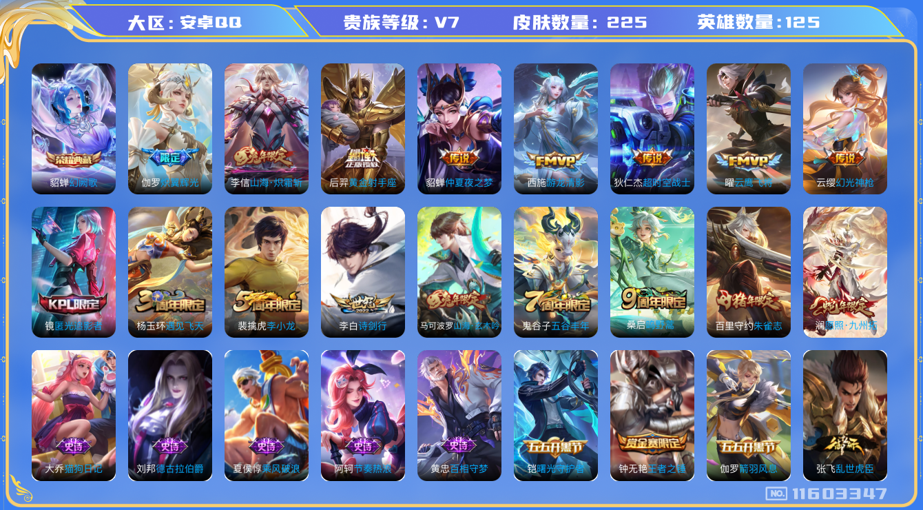 [11603347]V7 1典藏 11传说 125英雄 225皮肤 可修改实名 优质装备:幻阙歌(貂蝉典藏),黄金射手座,云鹰飞将(小将军),仲夏夜之梦(大飞蛾),游龙清影(小青龙),超时空战士-狄仁杰,山海·炽霜斩(李信年限),炽翼辉光(娃娃菜牛角包) 传说皮:幻光神枪 珍宝阁皮:胡桃夹子,女武神,玩趣恶龙 限定皮:愿照·九州拓(澜年限),鸣野蒿,遇见飞天,诗剑行,五谷丰年,李小龙,朱雀志(守约年限),匿光追影者,山海·玄木吟(马可年限) 史诗皮:星界战将,百相守梦-黄忠,紫霞仙子,苍穹之光,电玩小子(小书包),白龙吟,黄金分割率,特工魅影,千年之狐,江河有灵,蒙恬荣光圣徽,冰冠公主,偶像歌手,电玩·爆裂旋风,末日机甲-吕布,猫狗日记-孙策,猫狗日记-大乔,乱世虎臣,节奏热浪,女仆咖啡,摇滚巨星,水果甜心,星夜王子,功夫厨神,德古拉伯爵,暗隐猎兽者,鬼剑武藏,心灵战警,舞动绿茵,纤云弄巧,缤纷独角兽,乘风破浪,逐浪之夏,水晶猎龙者,曙光守护者,箭羽风息,金属风暴,原初追逐者,圣诞狂欢,圣诞恋歌,鹰眼统帅,王者之锤,暗夜贵公子,魅力维加斯,黎明之约,无心,未来纪元-赵云