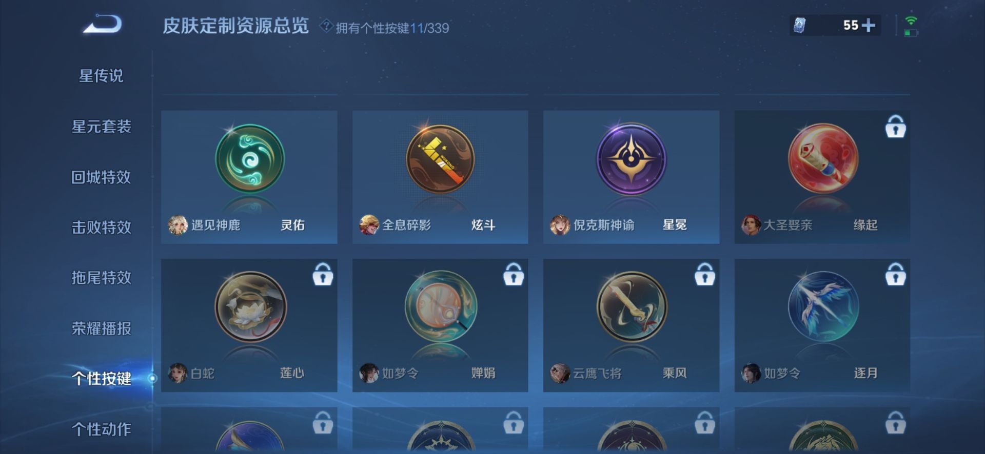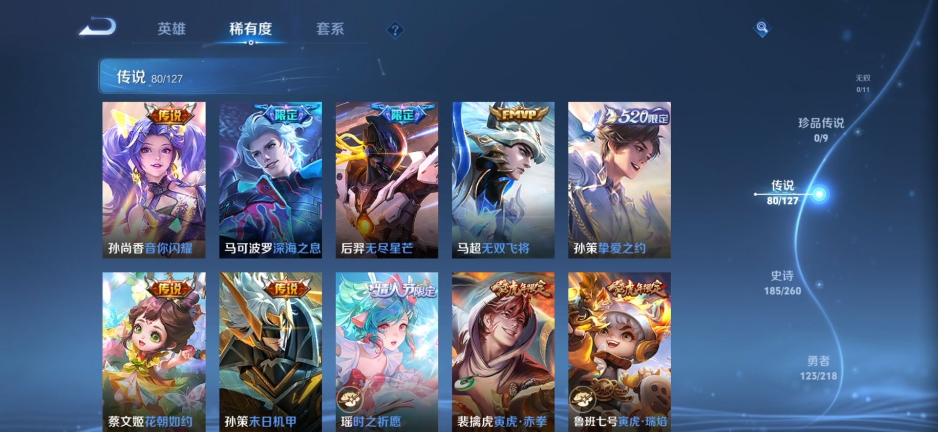 大乔白鹤梁神女,金蝉唐三藏,黄忠烈魂,甄姬幽恒,甄姬女儿国国王,盾山梦圆繁星,铠青龙志,廉颇寅虎·御盾,曹操天狼征服者,伽罗天狼溯光者,伽罗太华,苏烈玄武志,张飞虎魄,赵云龙胆,孙膑天狼运算者,孙膑寅虎·展翼,干将莫邪冰霜恋舞曲,小乔纯白花嫁,典韦岱宗,孙尚香异界灵契,不知火舞绯月行,牛魔奔雷神使,鲁班七号乒乒小将,项羽霸王别姬,鲁班七号寅虎·瑞焰,后羿无尽星芒,吕布御风骁将,后羿如梦令,后羿辉光之辰,露娜一生所爱,庄周玄嵩,镜匿光追影者,庄周云端筑梦师,周瑜真爱至上,诸葛亮时雨天司,杨玉环寅虎·心曲,兰陵王默契交锋,公孙离祈雪灵祝,公孙离蜜橘之夏,鲁班大师匿光启智者,裴擒虎李小龙,裴擒虎天狼狩猎者,裴擒虎寅虎·赤拳,东皇太一逐梦之光,上官婉儿梁祝,上官婉儿神器·万象笔,上官婉儿天狼绘梦者,李白诗剑行,花木兰默契交锋,花木兰瑞麟志,花木兰青春决赛季,安琪拉魔法小厨娘,马可波罗逐梦之星,马可波罗山海·玄木吟,马可波罗深海之息,猪八戒猪悟能,孙悟空孙行者,孙悟空大圣娶亲,芈月白晶晶,孙悟空至尊宝,百里玄策白虎志,马超神威,雅典娜神奇女侠,赵云引擎之心,盘古冰霜神祇,云中君时之祈愿,妲己时之彼端,妲己时之奇旅,韩信傲雪梅枪,韩信飞衡,韩信逐梦之影,百里守约朱雀志,蔡文姬奇迹圣诞,墨子降魔,瑶时之祈愿,瑶山海·碧波行,虞姬霸王别姬,娜可露露前尘镜,妲己热情桑巴,王昭君凤凰于飞,嫦娥如梦令,王昭君星穹之声,关羽武圣,关羽冰锋战神,橘右京枫霜尽