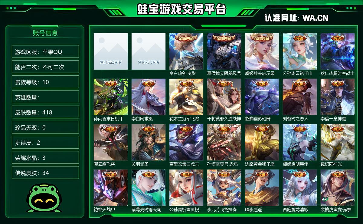 苹果QQ 不可二次 贵族10 段位非凡王者 皮肤价值352002 英雄数量 皮肤数量418 荣耀水晶3 传说皮肤34 珍品2 限定皮肤40 无双皮肤0 内测3 赛季皮肤28 史诗皮肤57 普通皮肤38 其他336